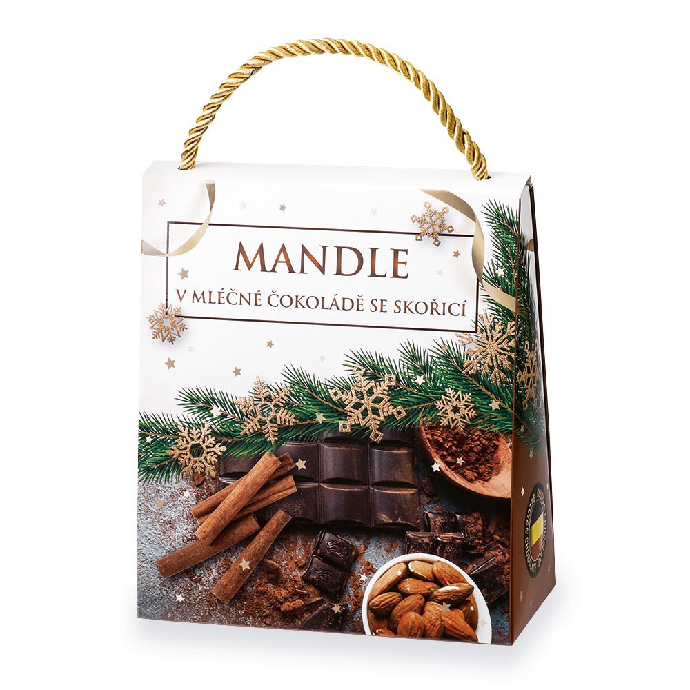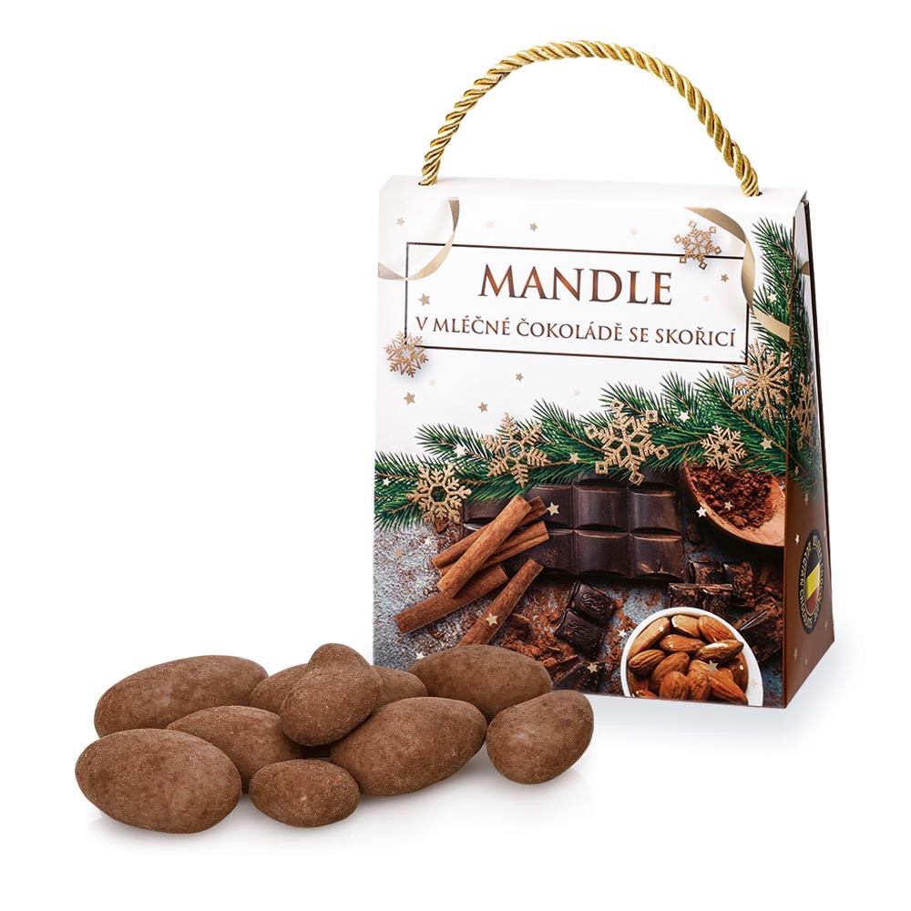 Mandle v mléčné čokoládě se skořicí, 200 g.