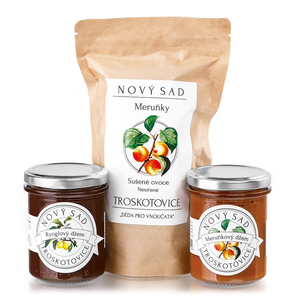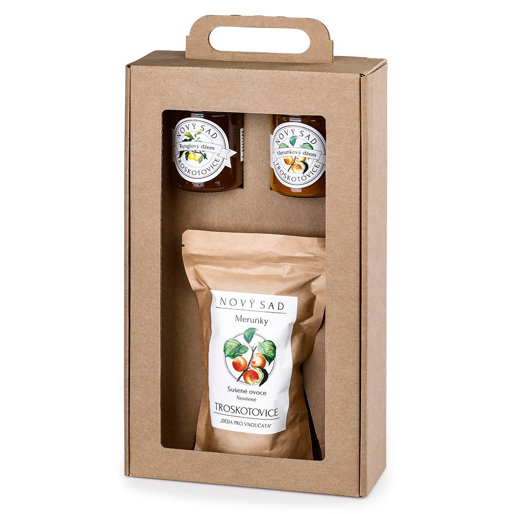 Dárkový set s džemem z meruněk (200 g), rynglovým džemem (200 g) a sušenými meruňkami, nesířené (200 g).