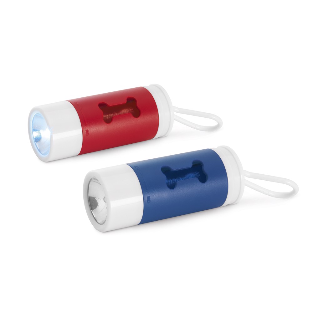 Zásobník na pytlíky na psí exkrementy z ABS s LED a klipem-karabinou. Dodáváno s dvaceti plastovými hygienickými sáčky a třemi LR1130 bateriemi.Zásobník: ø40 x 100 mm | Sáček: 265 x 310 mm