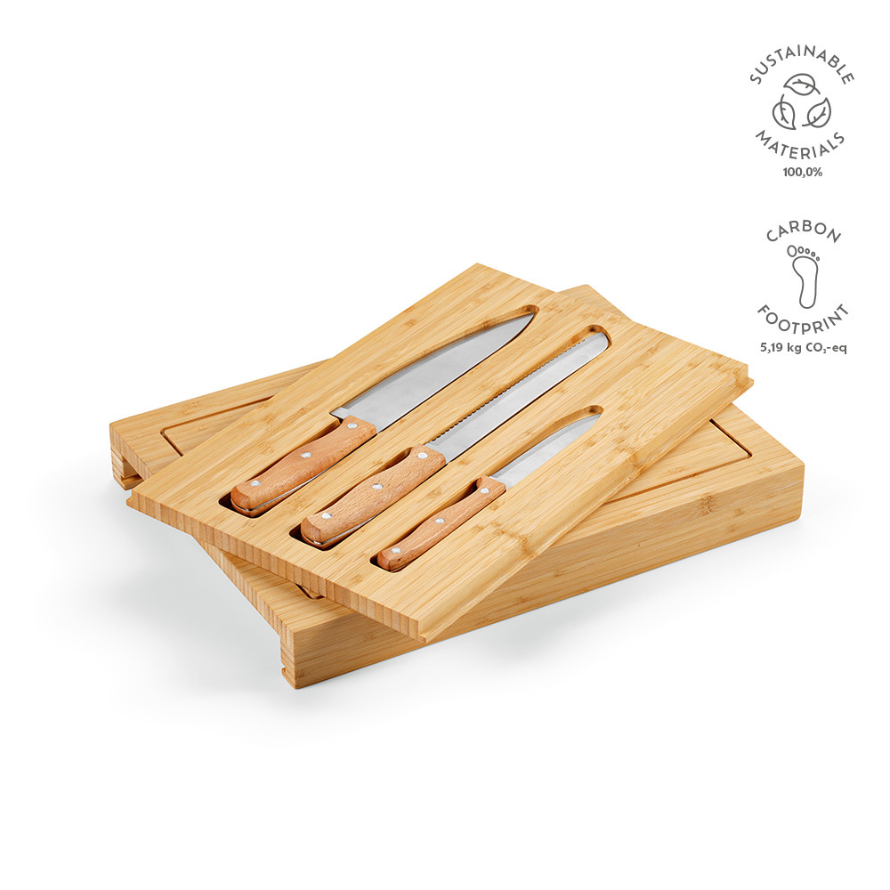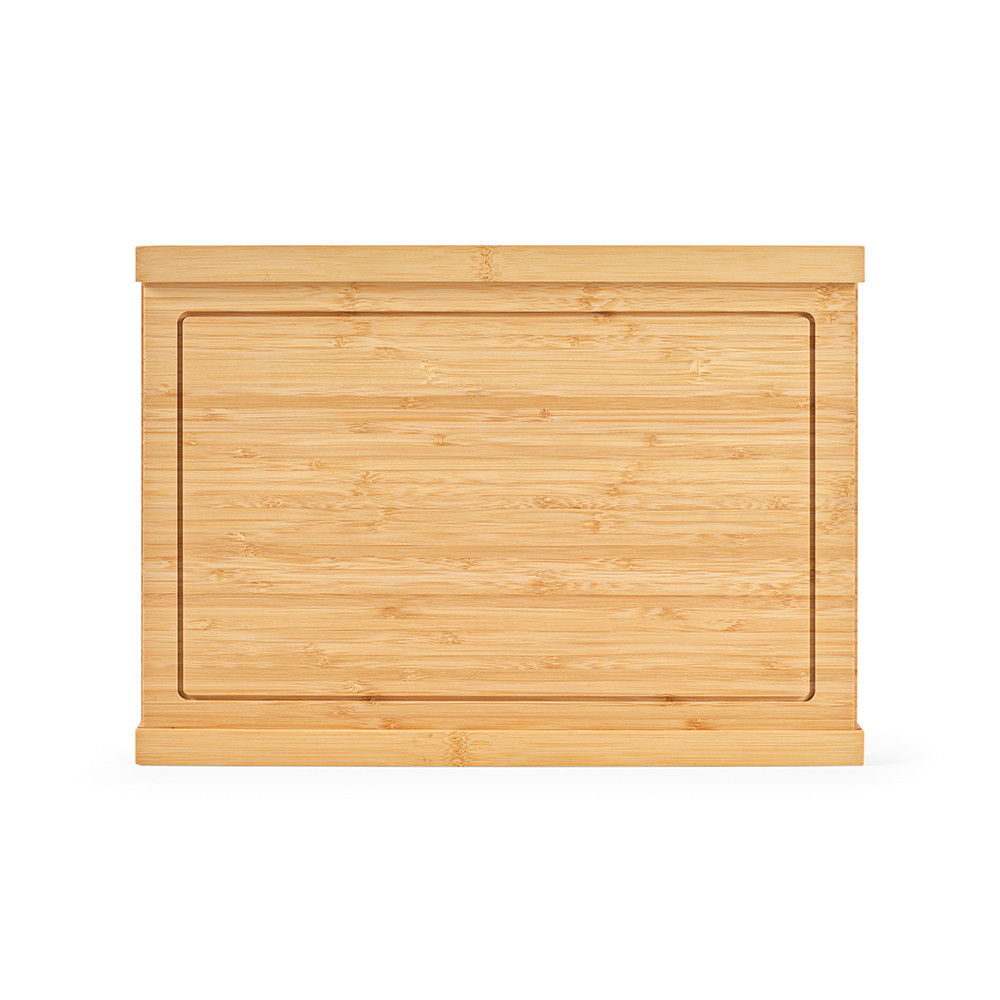 Bambusové prkénko Brancusi s rozměry 28 x 39 x 4,5 cm a drážkou po obvodu skrývá tajemství – výsuvný zásobník se třemi kuchyňskými noži: 1 na chléb, 1 šéfkuchařský a 1 na zeleninu. Dodáváno v kraftové krabičce.