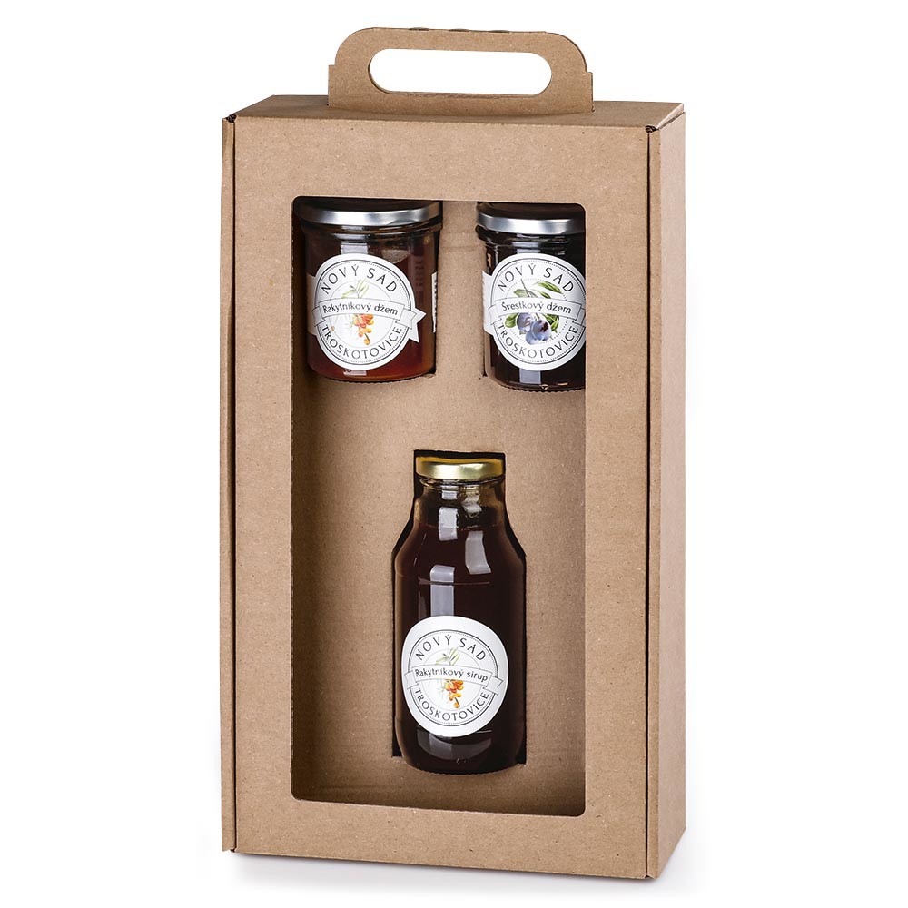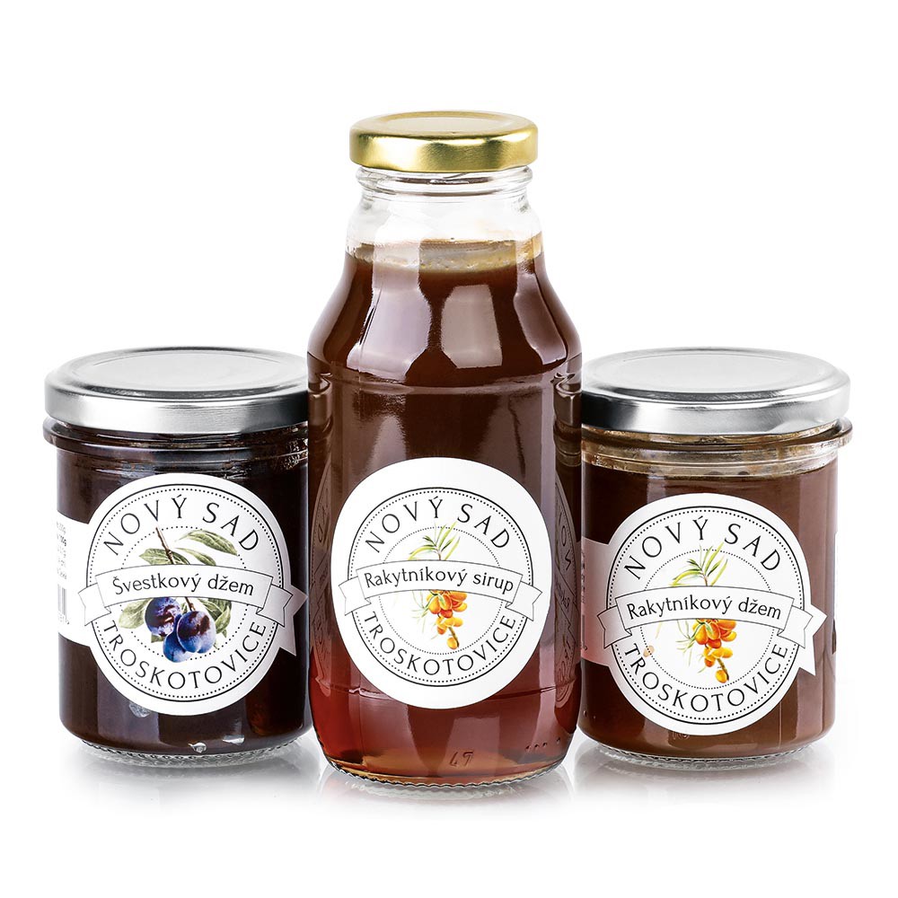 Dárkový set s rakytníkovým sirupem (330 ml), džemem z rakytníku (200 g) a švestkovým džemem (200 g).