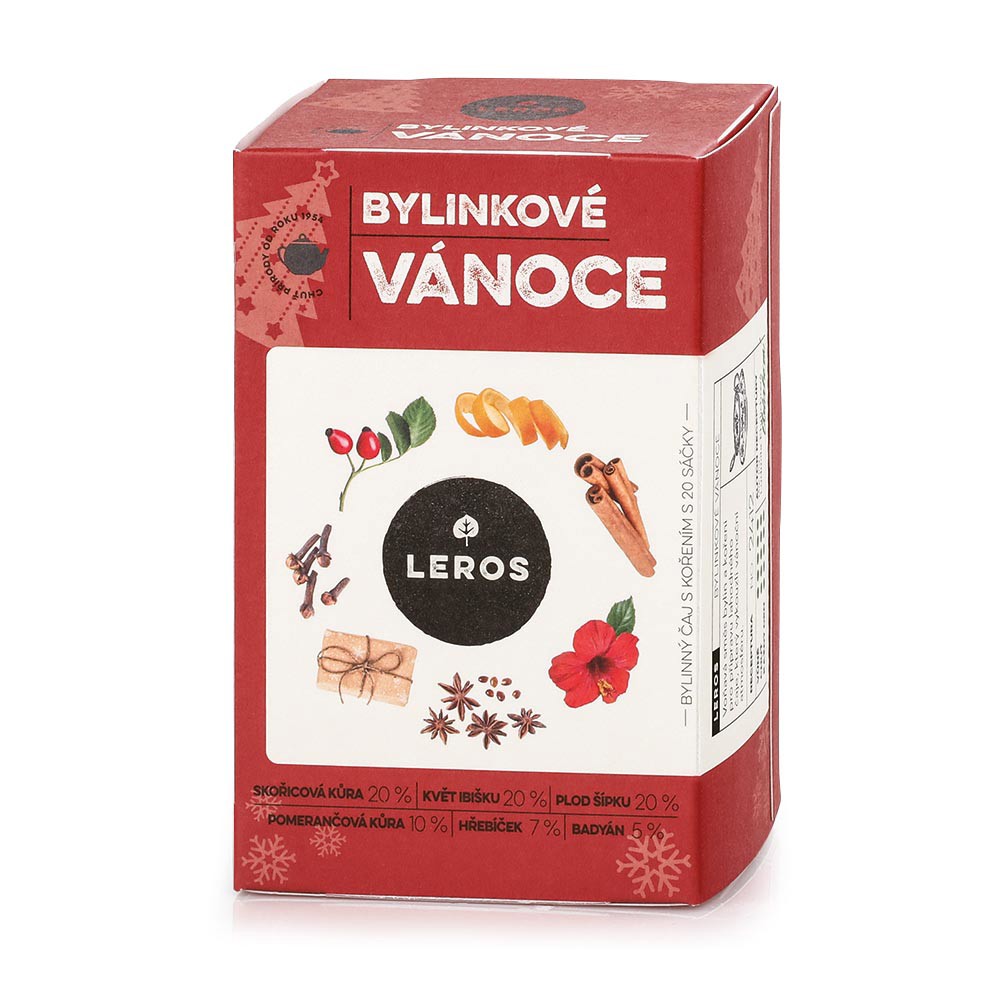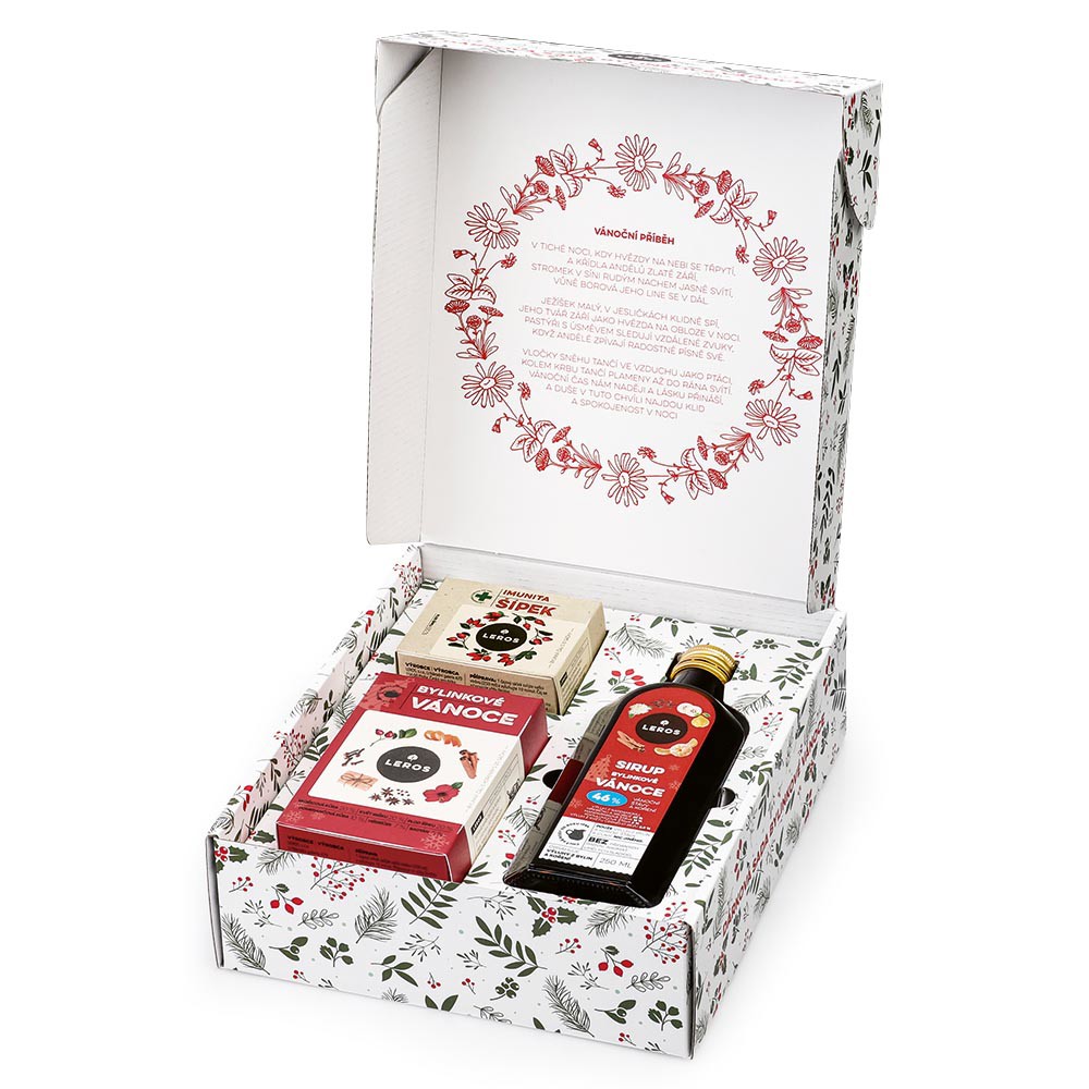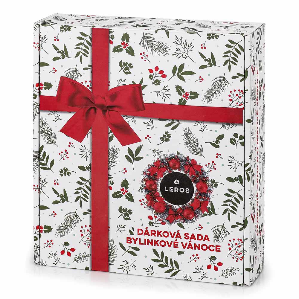 Dárková sada Leros. Obsahuje čaj Bylinkové vánoce (20 sáčků), sirup Bylinkové vánoce (250 ml) a čaj Imunita šípek (10 sáčků).