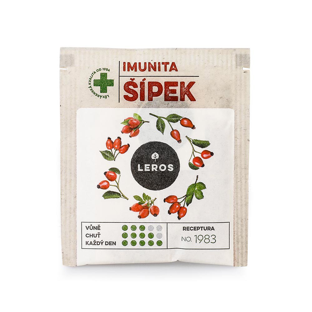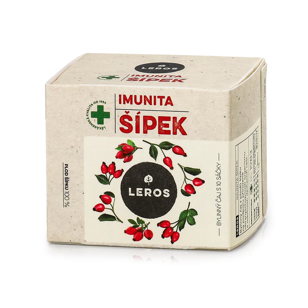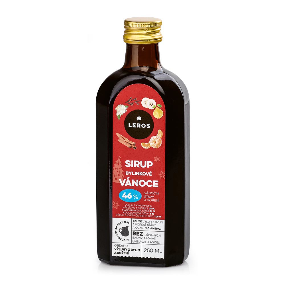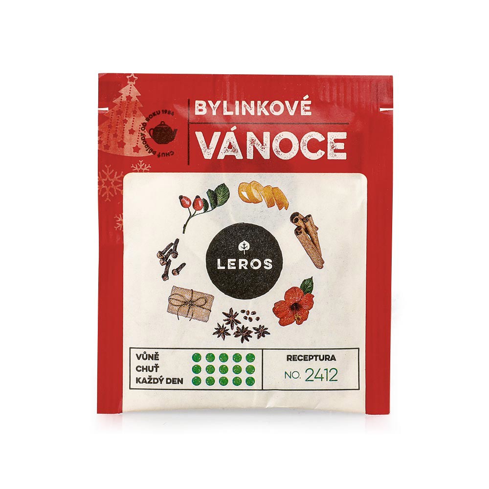 Dárková sada Leros. Obsahuje čaj Bylinkové vánoce (20 sáčků), sirup Bylinkové vánoce (250 ml) a čaj Imunita šípek (10 sáčků).