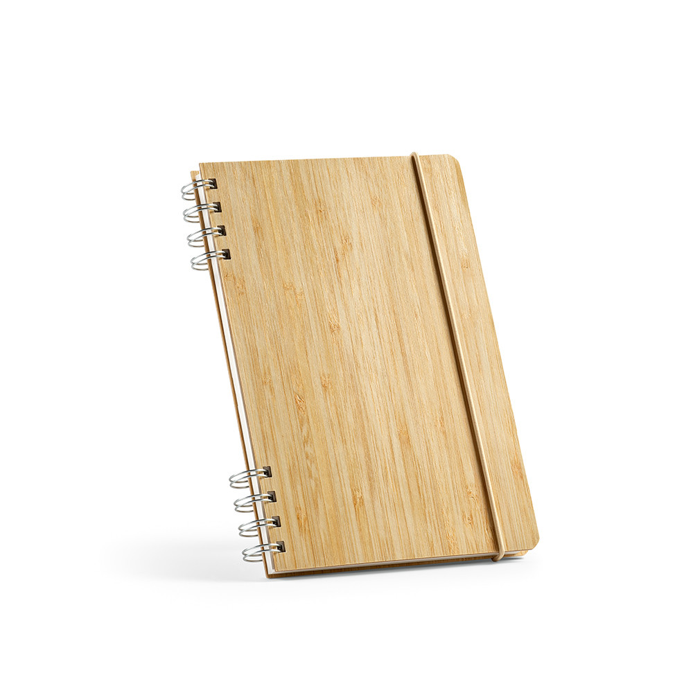 Zápisník Dante A5 s bambusovým obalem. Obsahuje 196 recyklovaných tečkovaných stran (70 g/m²) s prostorem pro datum a číslo stránky, tenkou vertikální gumu a unikátním spirálovým designem hřbetu, nabízející funkční eleganci. Dodáván jednotlivě v kraftovém obalu.