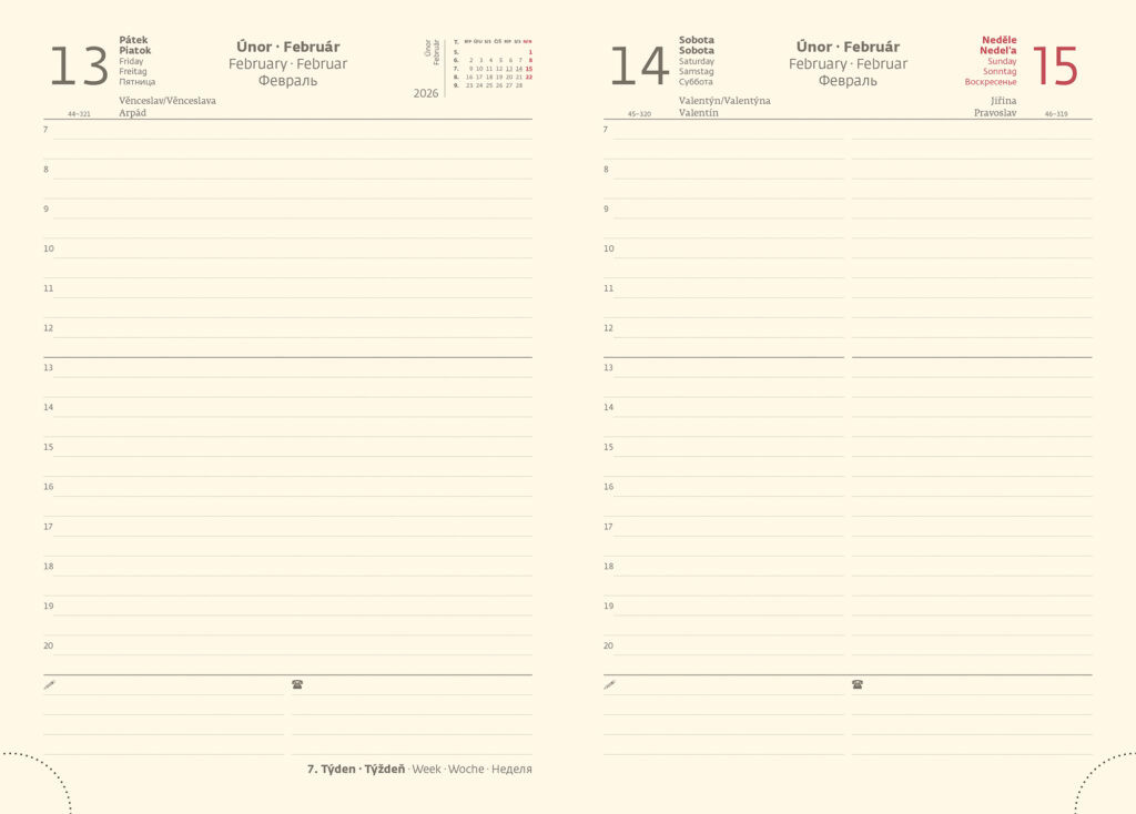 Diář obsahuje: osobní údaje, plánovač dovolené (měsíční přehled), plánovací kalendář, telefonní předvolby, státní svátky České a Slovenské republiky, mezinárodní svátky, roční výhled, denní layout, adresář, mapa Evropy a České a Slovenské republiky
