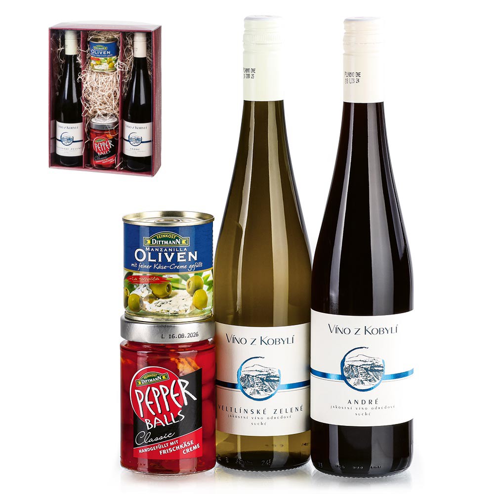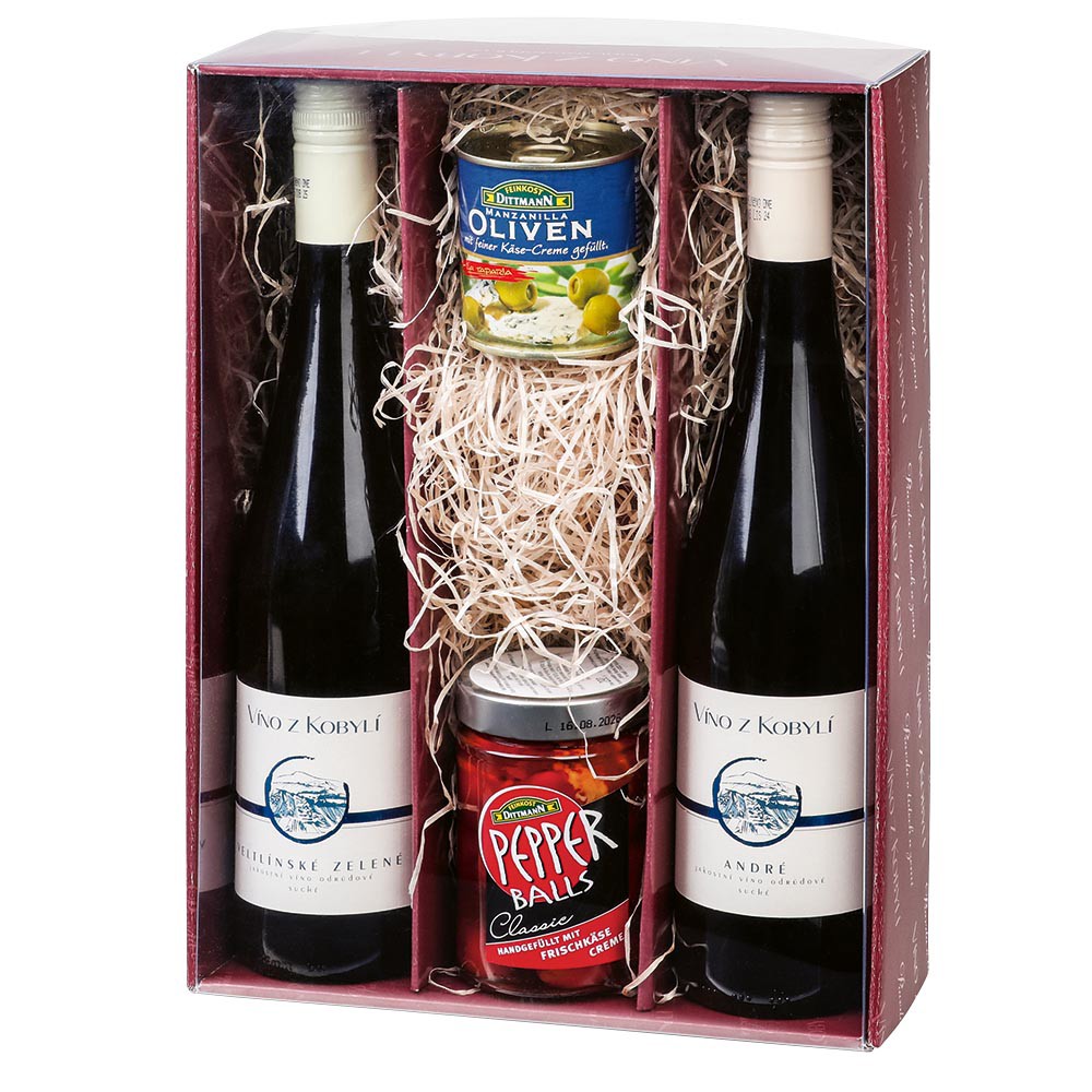 Dárkový set v krabici s průhledným víkem. Obsahuje bílé víno suché Veltlínské zelené (750ml), červené víno suché André (750 ml), papriky plněné čerstvým sýrem a olivy se sýrem s modrou plísní.