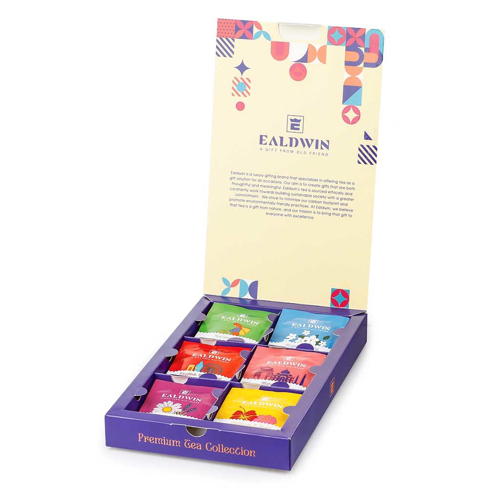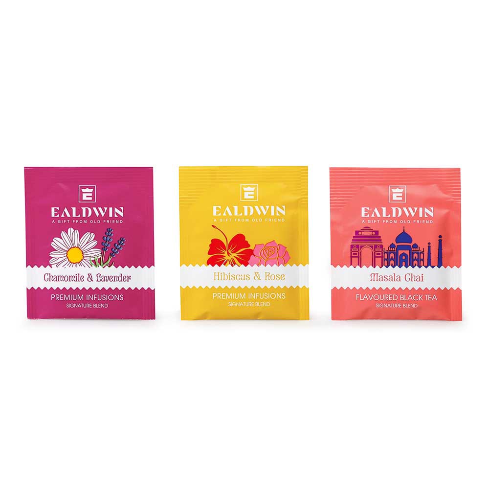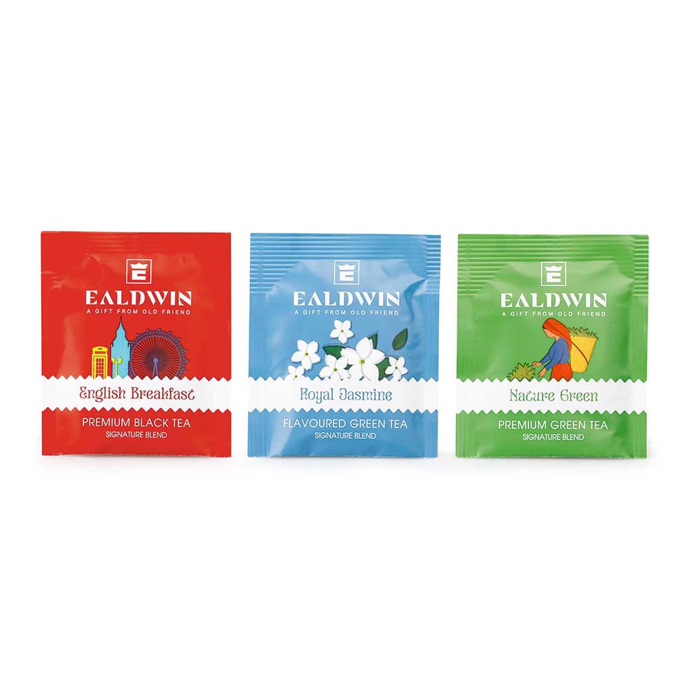 Kolekce porcovaných čajů Ealdwin, 6× 5 sáčků. Příchutě English Breakfast, Masala Chai, Nature Green, Royal Jasmine, Turmeric & Ginger, Chamomile & Lavender.