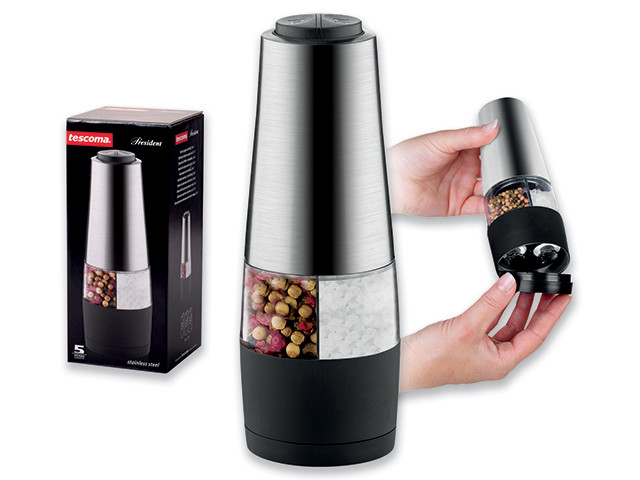 Elektrický mlýnek pro čerstvě mletý pepř a sůl 2 v 1. Keramický mlecí mechanismus s nastavitelnou hrubostí mletí a víčkem pro zachytávání zbytků koření. Vyrobeno z nerezové oceli a odolného plastu, opatřeno výkonným motorem. Baterie AAA (6 ks) nejsou součástí.