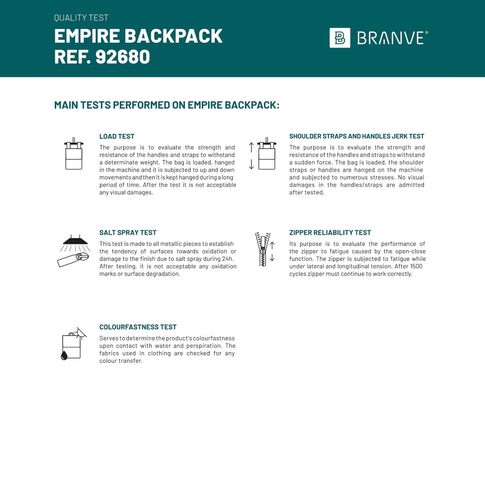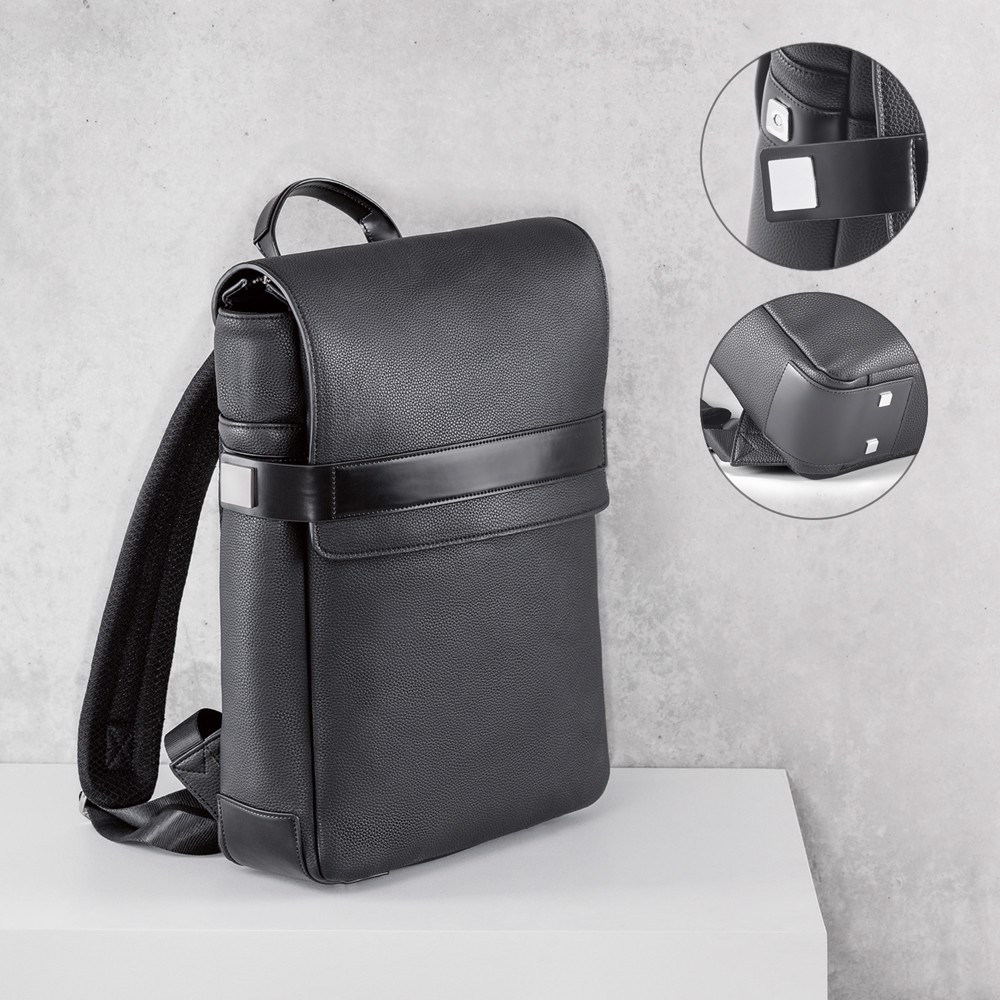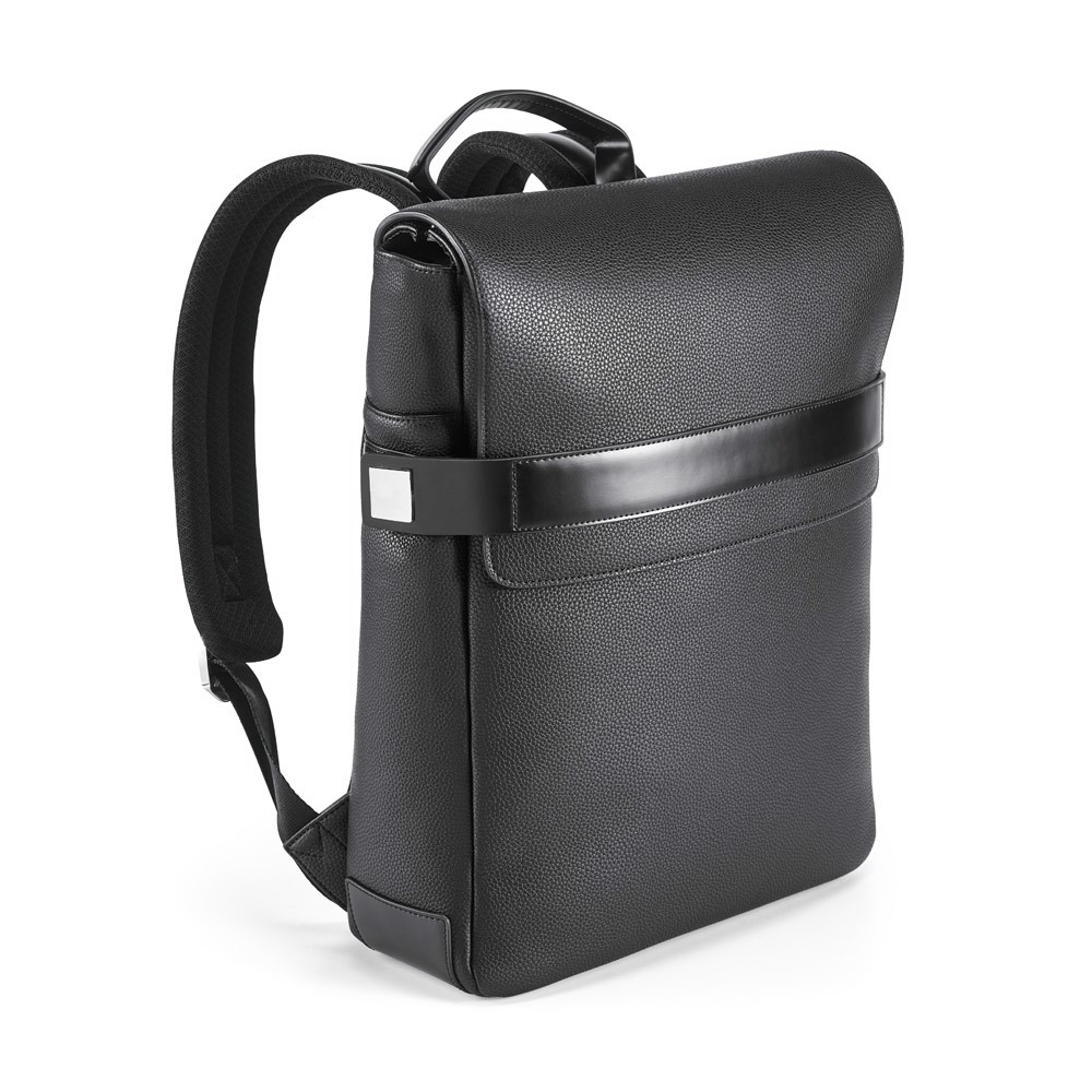 Sofistikovaný batoh z vysoce kvalitního texturovaného polypropylenu s klopou zakrývající přední kapsu a hlavní oddíl. Hlavní komora na zip, vnitřek se 2 polstrovanými přepážkami pro notebooky do 14" a tablety do 10.5" a různé kapsy. Zahrnuje boční zipy se silnými magnety a kovové destičky ideální pro personalizaci, plně polstrovaná záda a ramenní popruhy a popruh pro nošení na vozíku. Kapacita až 9 litrů. Dodáváno v sáčku z netkané textilie. Produkt obsahuje zprávu o testu kvality. Batoh: 290 x 370 x 90 mm | Taška: 500 x 500 x 80 mm