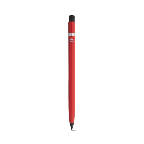 Nekonečná tužka s nekonečnou tuhou s tělem z recyklovaného hliníku (100% rAL) a uzávěrem z PE a hrotem z grafitu. Vhodné pro dlouhodobé používání bez nutnosti ostření. Nahoře obsahuje gumu, která snadno smaže napsané. ø8 x 150 mm