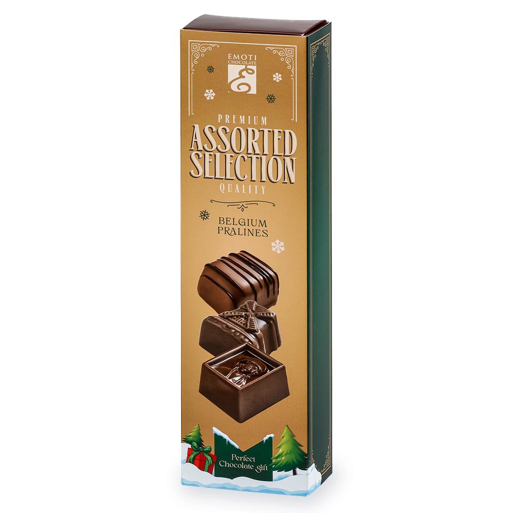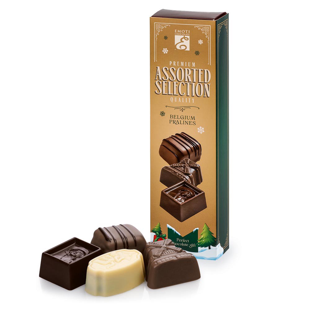 Výběr pralinek z mléčné a tmavé čokolády, lískooříšková náplň marcipán, 65 g.