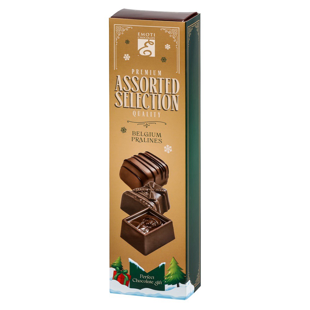 Výběr pralinek z mléčné a tmavé čokolády, lískooříšková náplň marcipán, 65 g. 60 × 37 × 216 mm