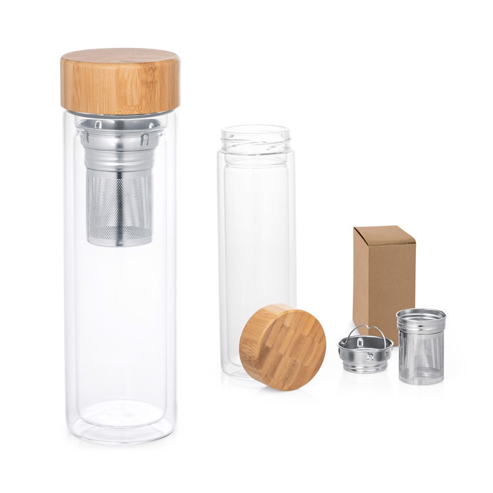 Dvouplášťová vakuově izolovaná láhev z borosilikátového skla s bambusovým víčkem. Dva infuzéry z nerezové oceli. Láhev má kapacitu až 490 ml. Vhodné do myčky nádobí, pokud je odstraněno víčko. Dodáváno v dárkové krabičce z kraftového papíru. Protože je výrobek vyroben z přírodních materiálů, barva a velikost výrobku a výsledek tisku se mohou u jednotlivých výrobků lišit. ø72 x 234 mm