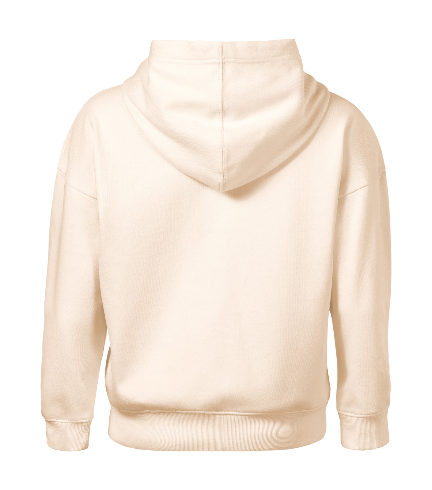Bez etikety - připraveno na rebranding, volný střih s bočními švy, kapuce s podšívkou, na stažení šňůrkou, neutrální velikostní štítek v boční části průkrčníku, vnitřní část průkrčníku začištěna páskou v barvě vrchového materiálu, nízkohlavicové rukávy, lištové kapsy ve stylu klokanky, dolní lem a manžety rukávů z žebrového úpletu 2:2 s 5 % elastanu, vnitřní strana počesaná