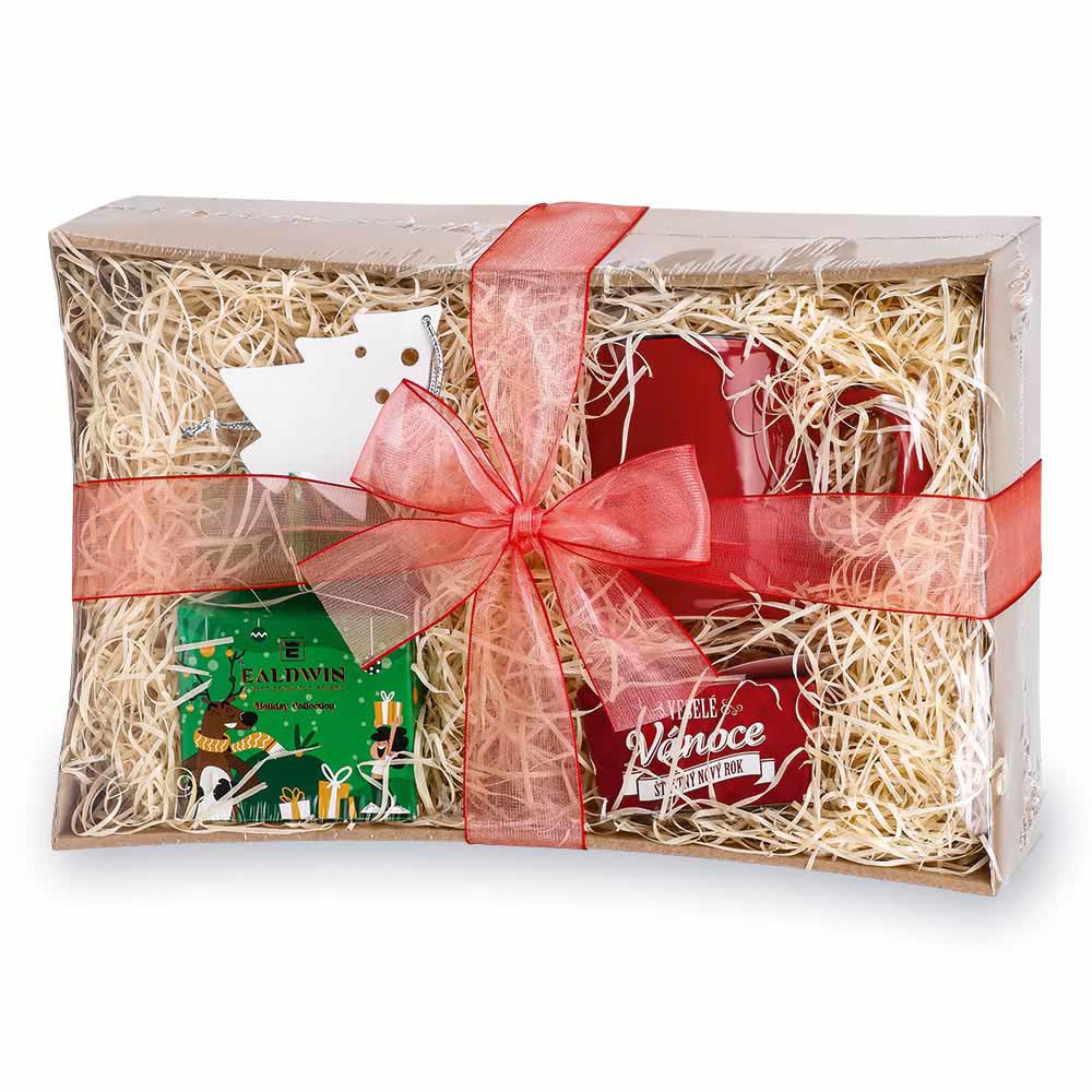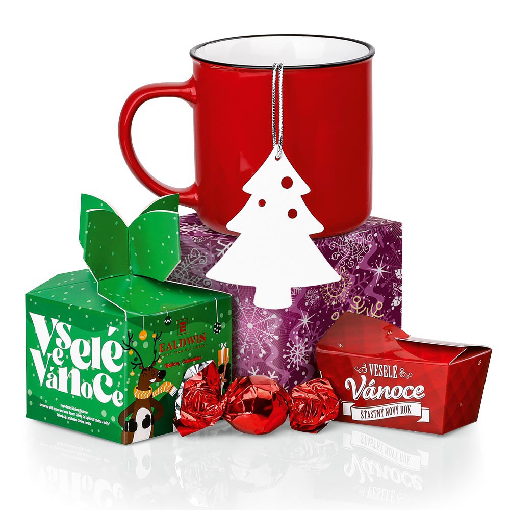 Dárkový set v krabici ovázaný červenou stuhou. Obsahuje červený keramický hrnek (340 ml), dárkovou krabičku 5 čajů Veselé vánoce (mix barev: zelená, červená, modrá - nelze vybrat), pralinky Veselé vánoce (28 g) a dřevěnou ozdobu ve tvaru stromečku (65 × 78 × 25 mm). Možnost kompletace a balení balíčků formou náhradního plnění ve vlastní chráněné dílně.