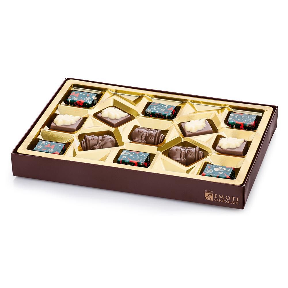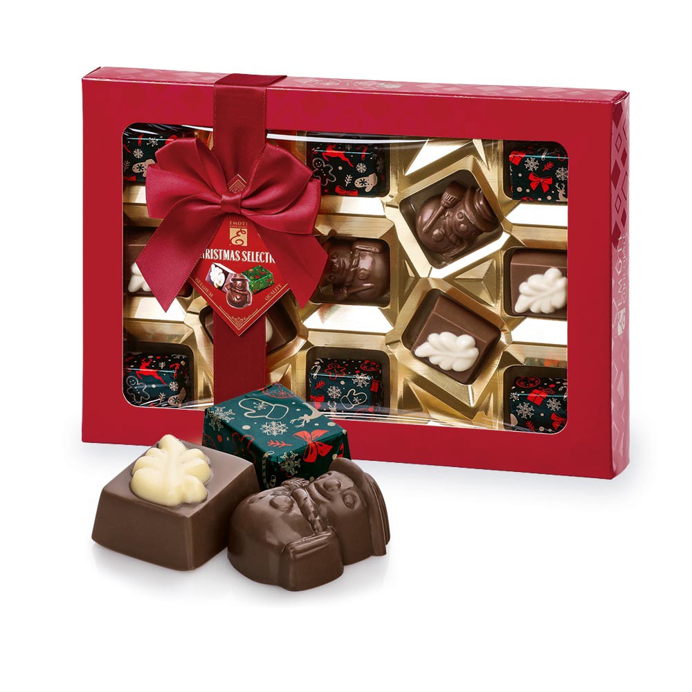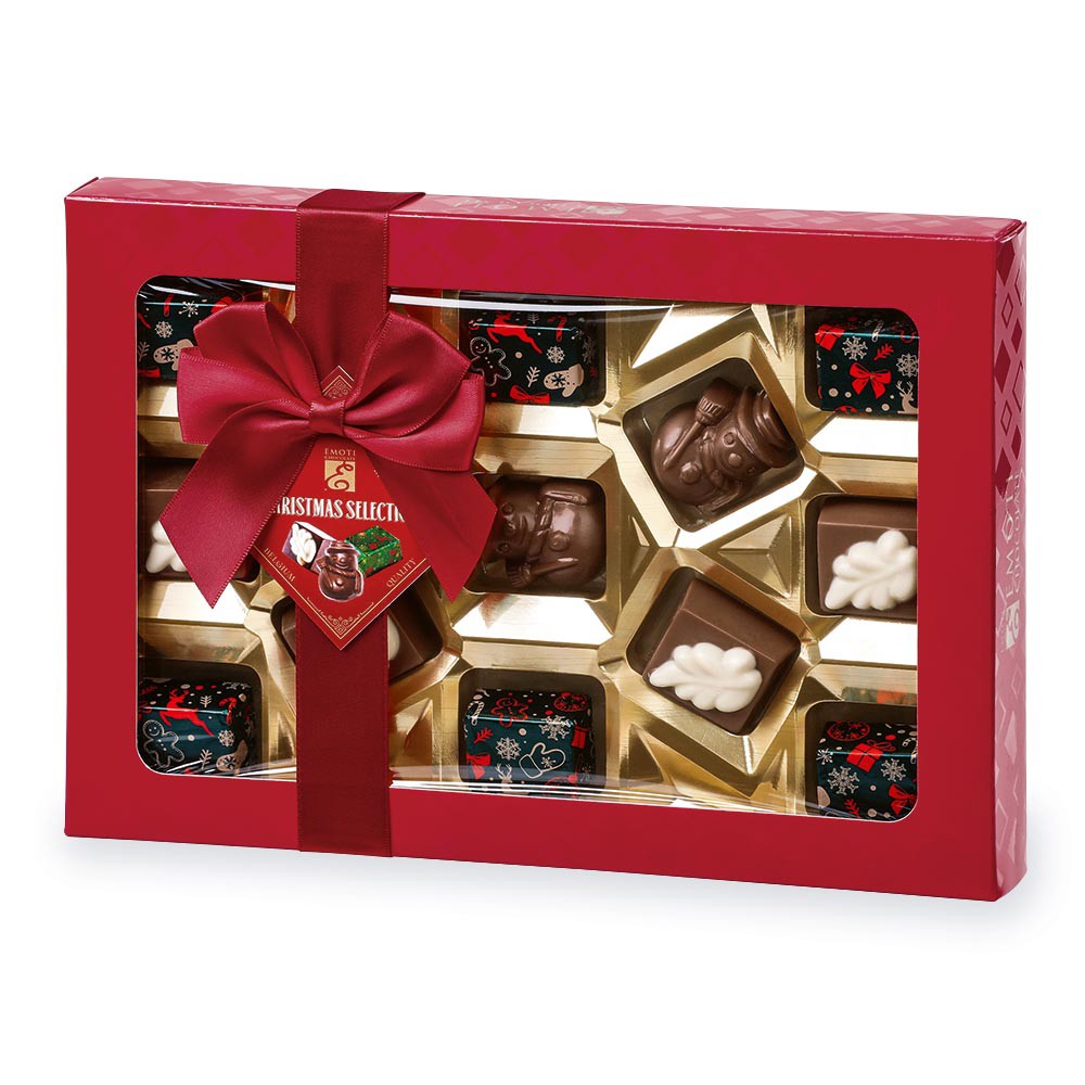 Výběr vánočních pralinek z mléčné čokolády, lískooříšková náplň. Převázáno saténovou mašlí, 195 g.