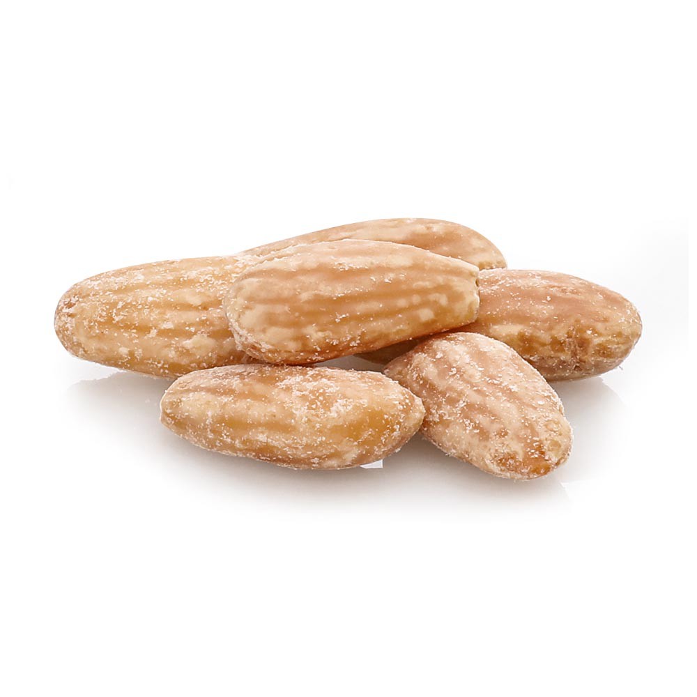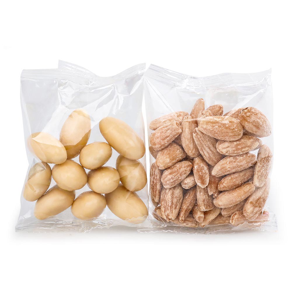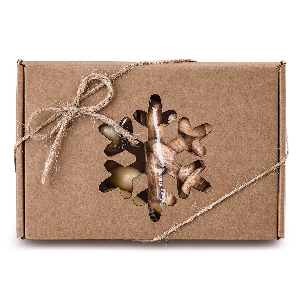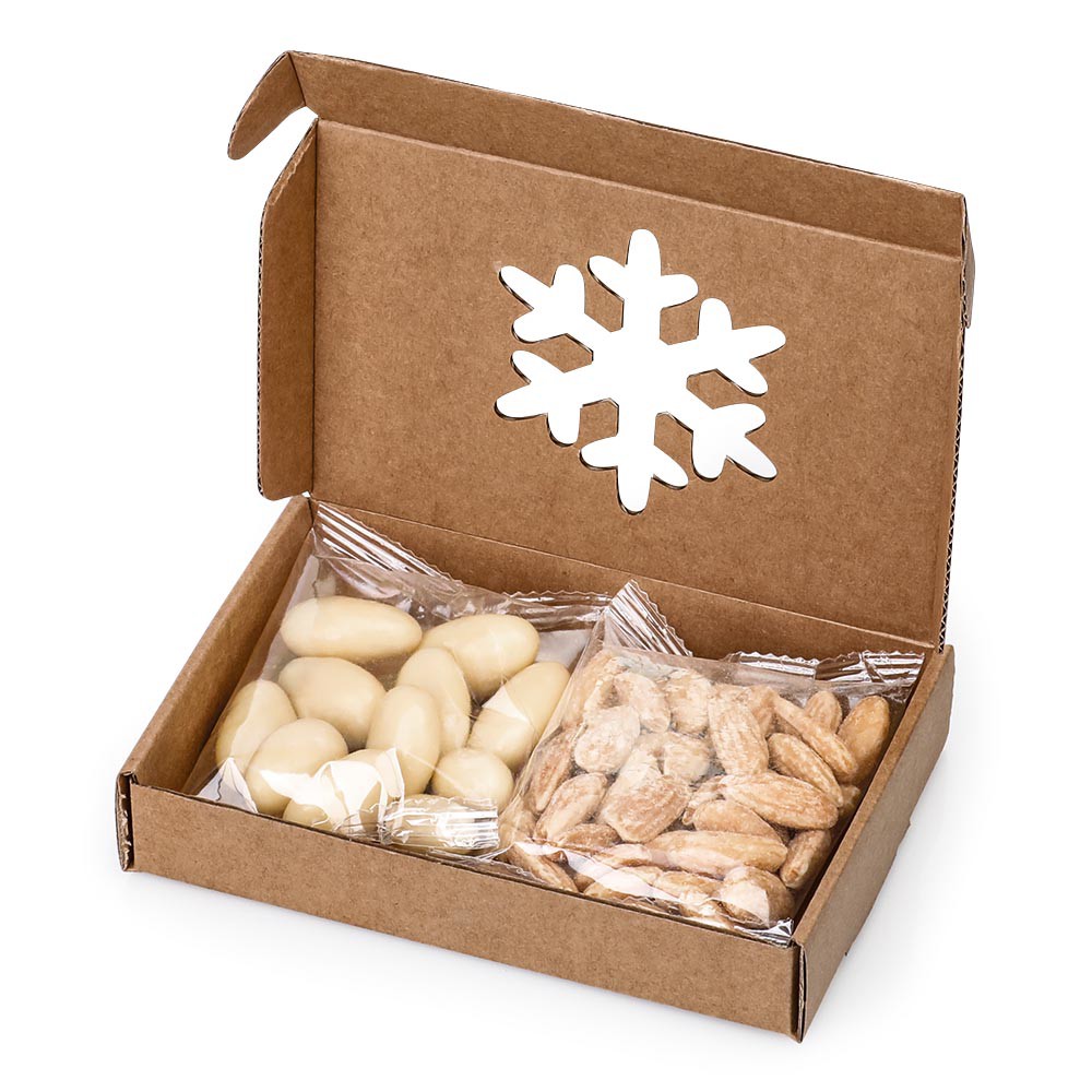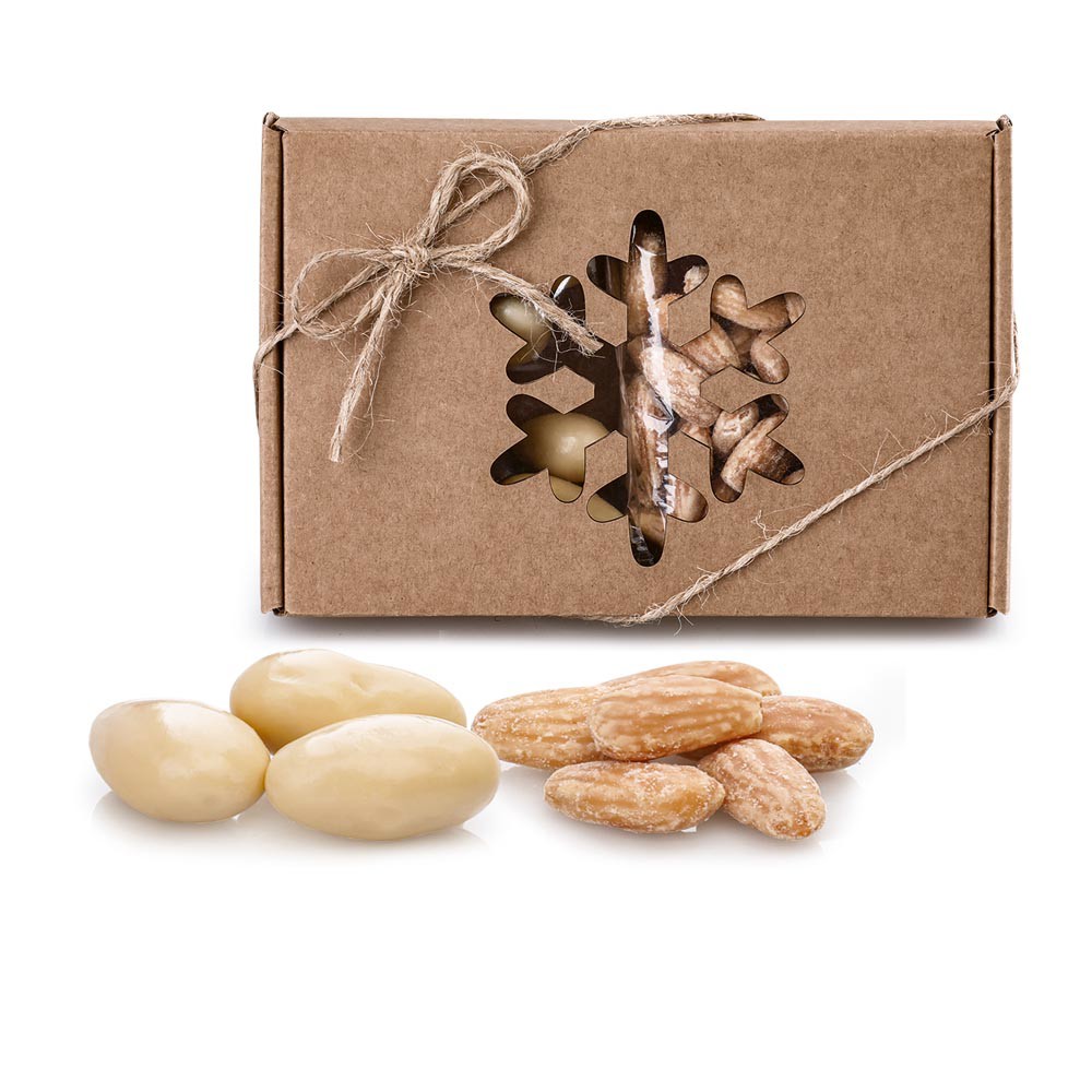 Dárková krabička s výřezem ve tvaru vločky, 80 g. Obsahuje slané mandle a mandle v jogurtu, 2× 40 g.