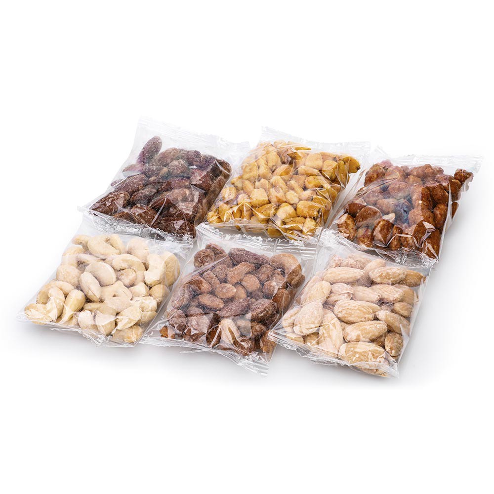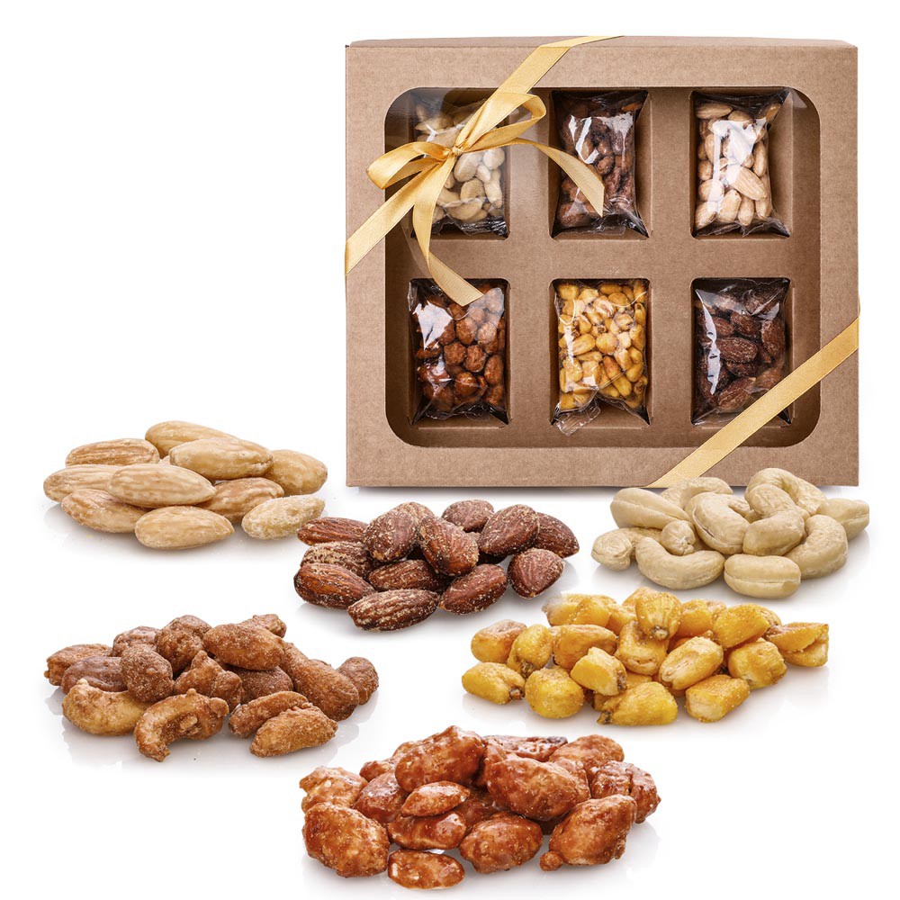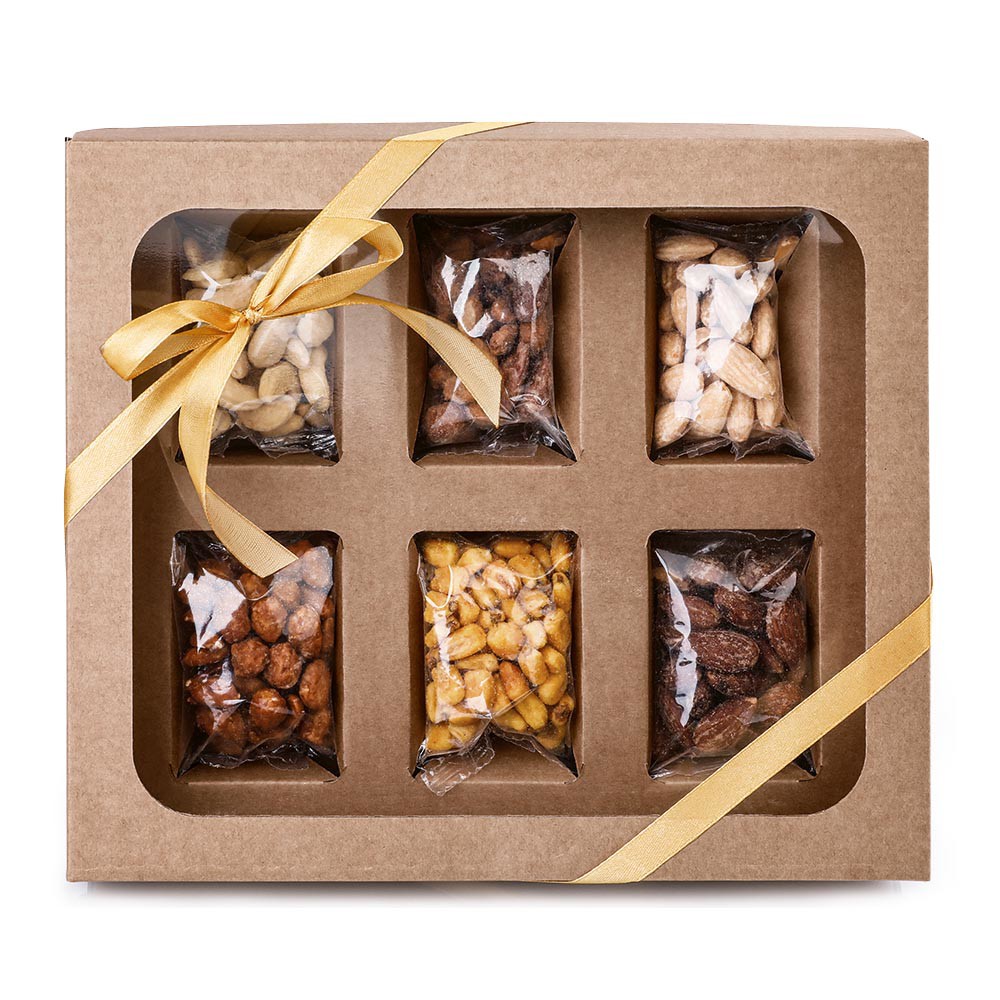 Dárková krabička se stuhou, 285 g. Obsahuje mandle uzené (50 g), mandle solené (50 g), mix v medu a soli (50 g), arašídy karamel a vanilka (50 g), kešu natural (50 g), kukuřice hořčice a med (35 g).