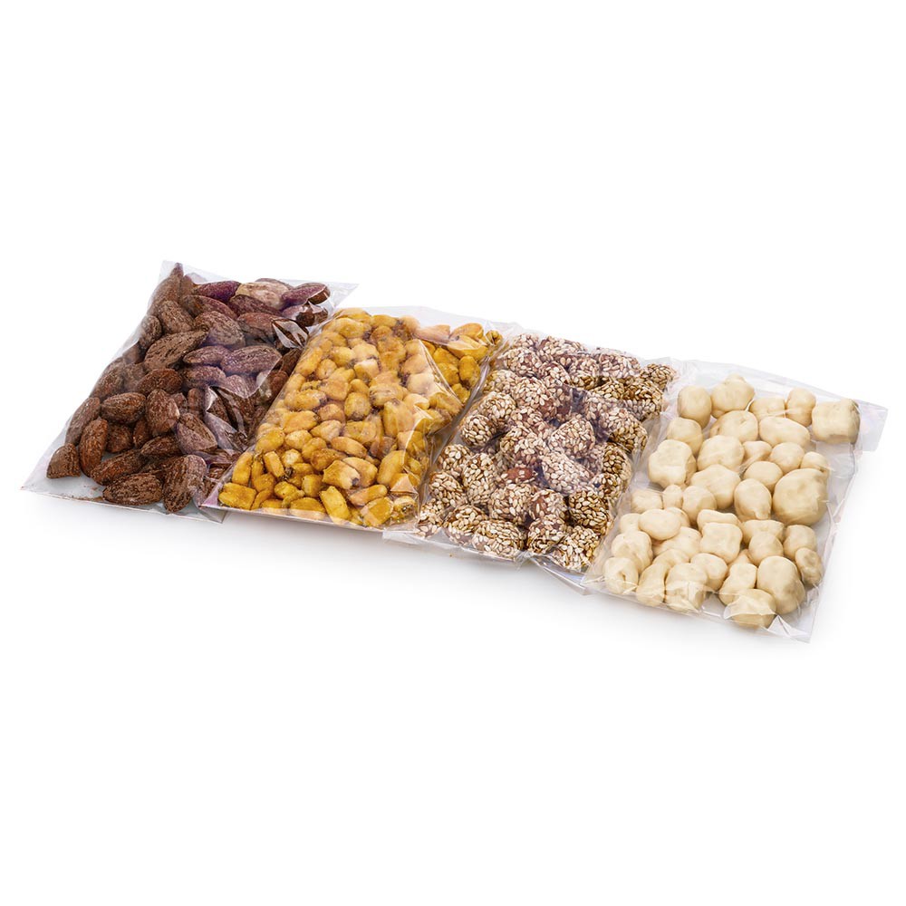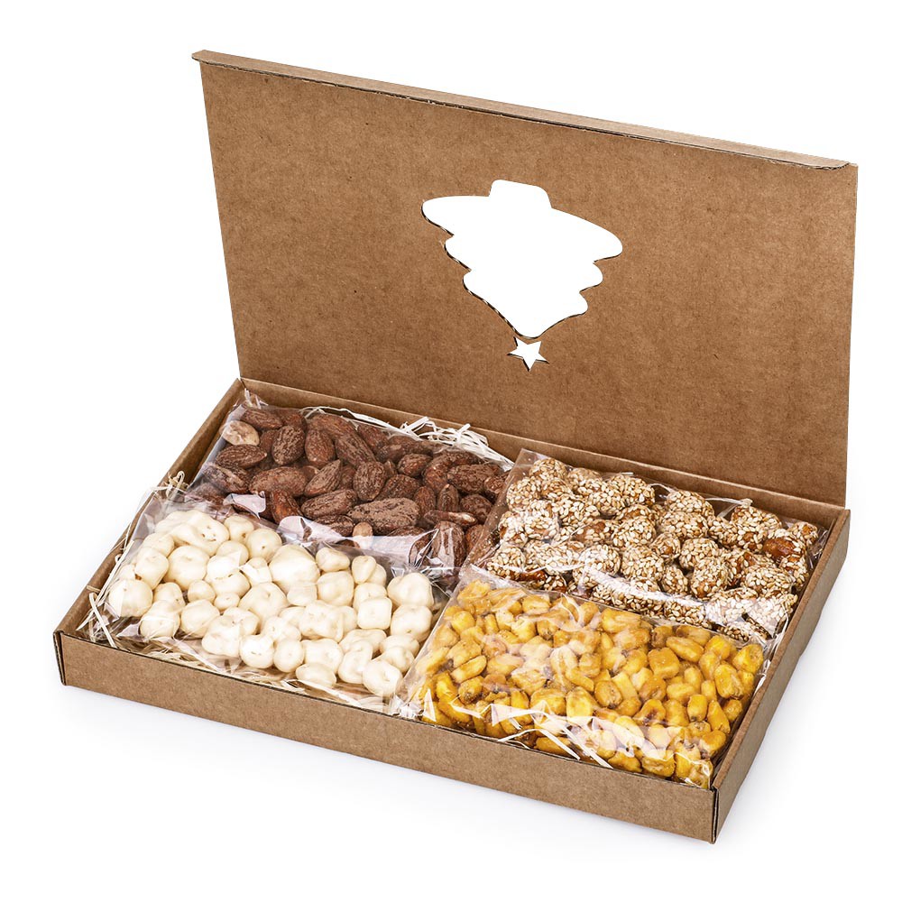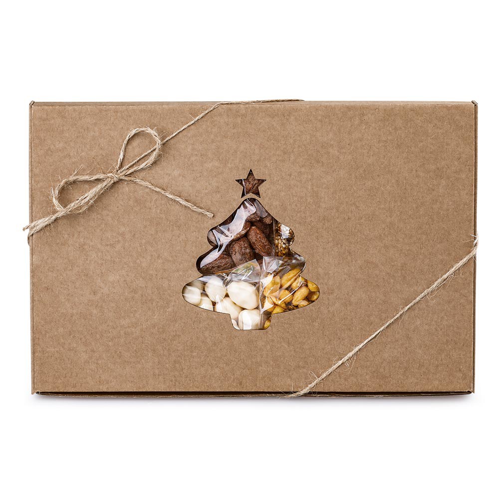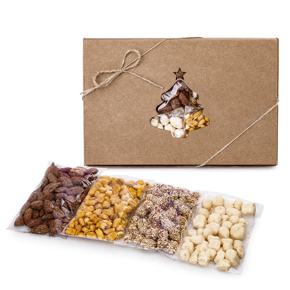 Dárková krabička s výřezem ve tvaru stromečku, 260 g. Obsahuje mandle uzené (70 g), arašídy v karamelu se sezamem (70 g), kukuřice v hořčici a medu (50 g) a meruňky v jogurtu (70 g).