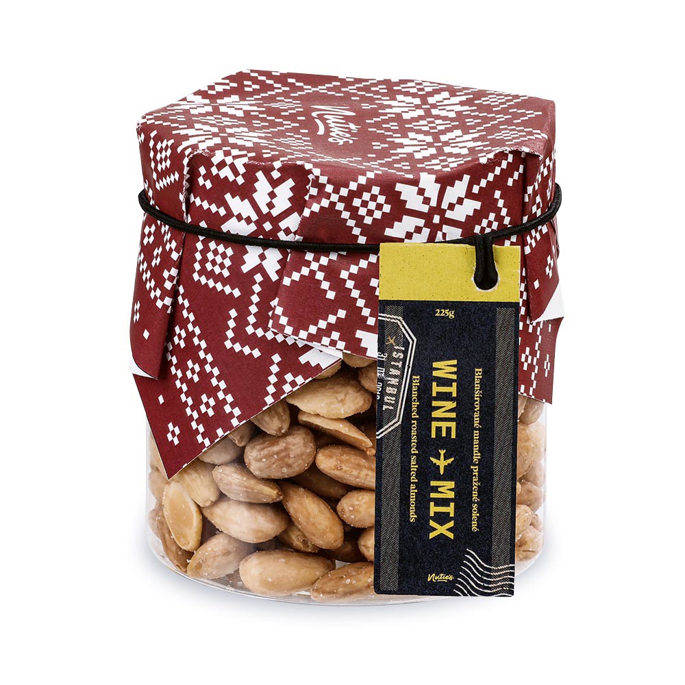 Mandle pražené solené blanšírované s vánočním přebalem, vhodné jako doplněk k vínu, 225 g.