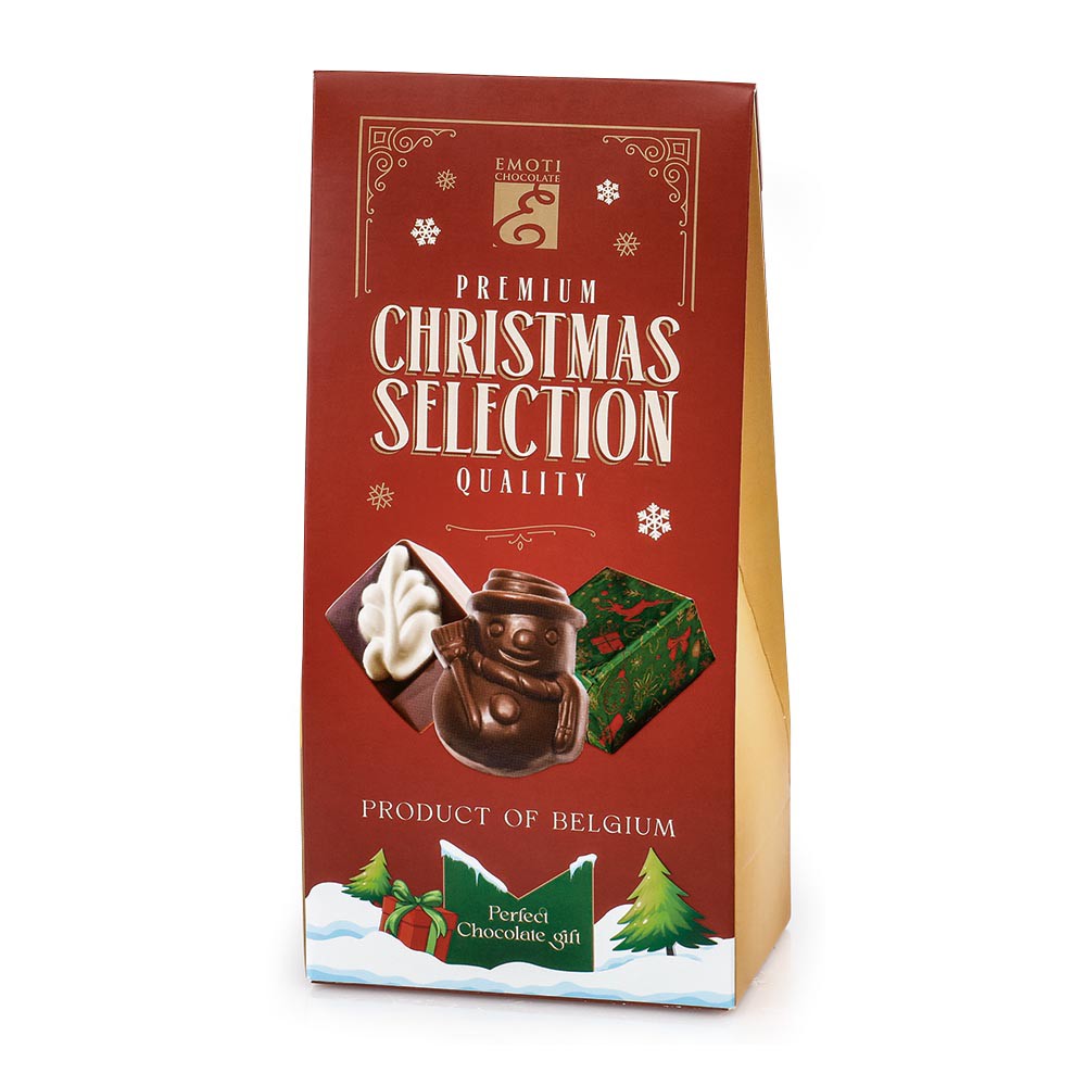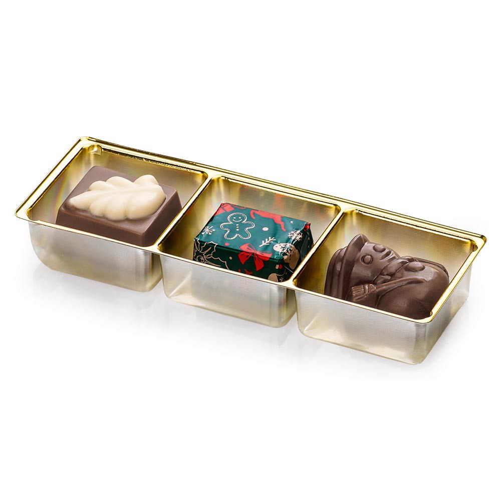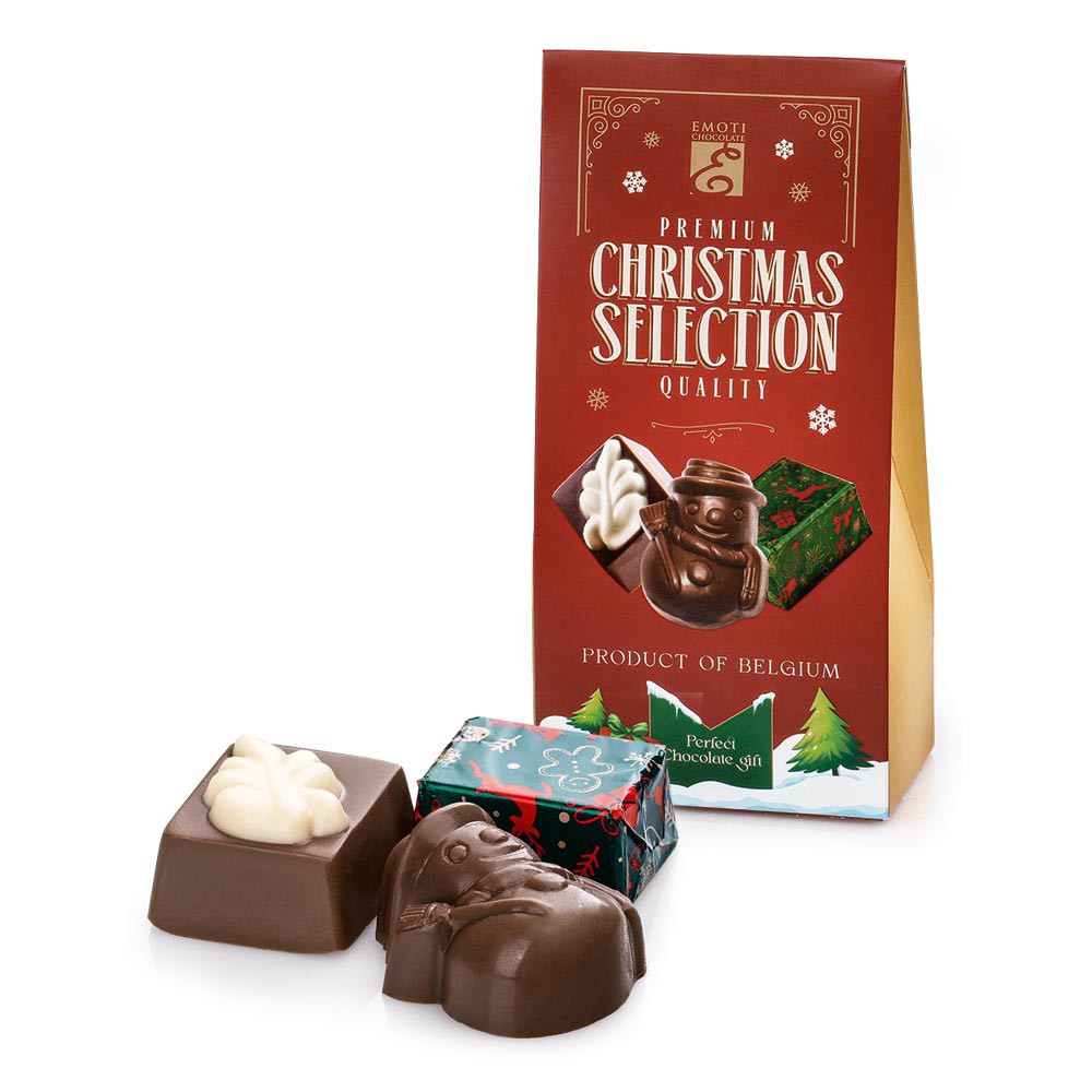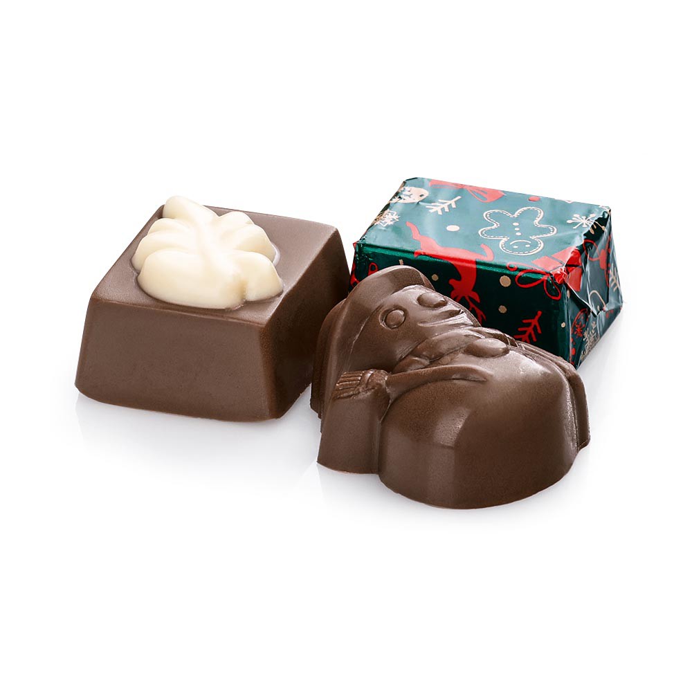 Výběr vánočních pralinek z mléčné čokolády s lískooříškovou náplní brésilienne, 45 g.