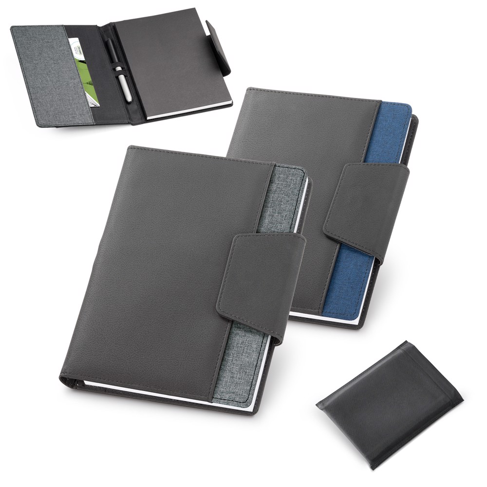 PU a polyesterová složka s poznámkovým blokem A5 uvnitř. Tato složka obsahuje magnetické zavírání, vnější kapsu, vnitřní kapsu a držák na pero (pero není součástí). Vyjímatelný poznámkový blok obsahuje 160 čistých stránek (70 g/m²), vyrobeno z materiálu certifikovaného FSC™ a dalších kontrolovaných materiálů. Dodáváno v netkaném sáčku. 155 x 215 mm | Obal: 205 x 250 mm