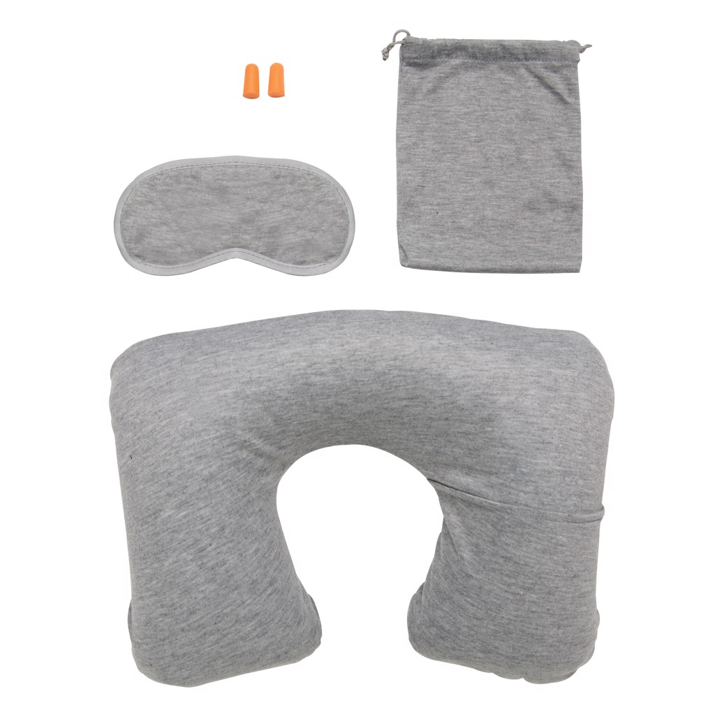 Žerzejová cestovní sada s kapsou na telefon nebo sluchátka. Měkká cestovní sada obsahuje nafukovací krční polštářek, masku na oči, měkké ucpávky do uší a měkký obal se stahovací šňůrkou.