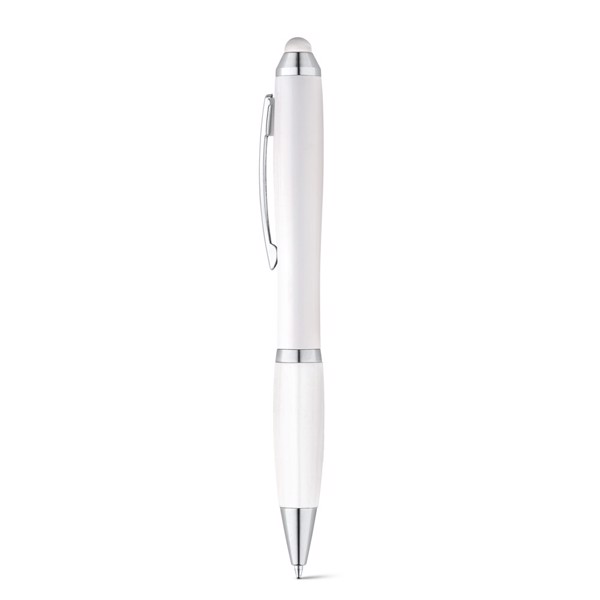 ABS kuličkové pero s kovovou sponou a otočným mechanismem. Vhodné pro použití na dotykových zařízeních díky gumové špičce. Pohodlné psaní díky protiskluzovému gripu, k dispozici v široké škále barev. Modrý inkoust. ø11 x 135 mm