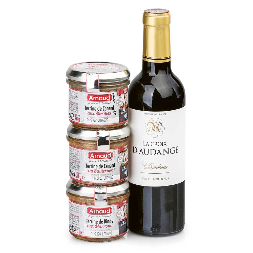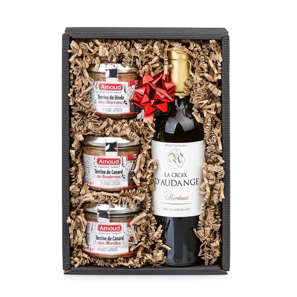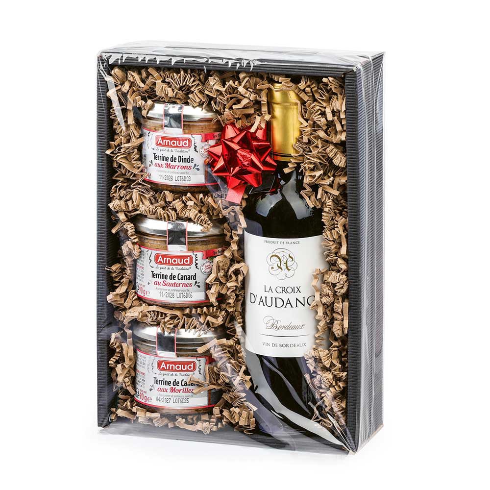 Dárkový set v krabici. Obsahuje Jean Brunet kachní paštiku s Armagnacem (180 g), Jean Brunet jelení paštiku (180 g) g), Jean Brunet kančí paštiku (180 g) a červené víno Maine d'Esteve - AOP Bordeaux francouzské červené víno (375 ml).