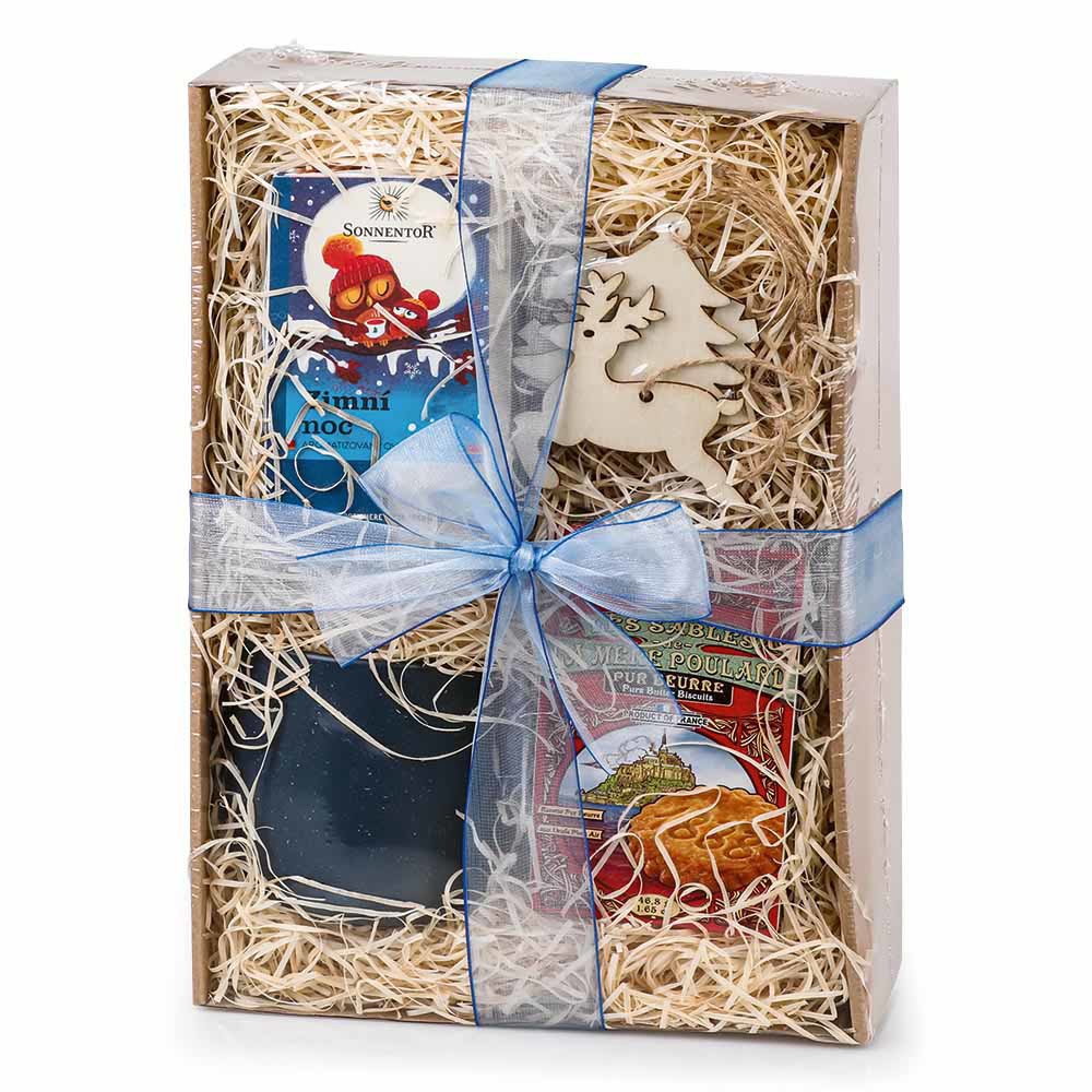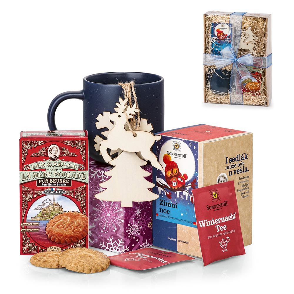 Dárkový set v krabici ovázaný modrou stuhou. Obsahuje tmavě modrý keramický hrnek s matným povrchem (370 ml), čaj Sonnentor Zimní noc (18 sáčků), francouzské máslové sušenky La Mére Poulard (46,8 g) a 3 dřevěné ozdoby (ca 80 × 80 × 2 mm). Možnost kompletace a balení balíčků formou náhradního plnění ve vlastní chráněné dílně.