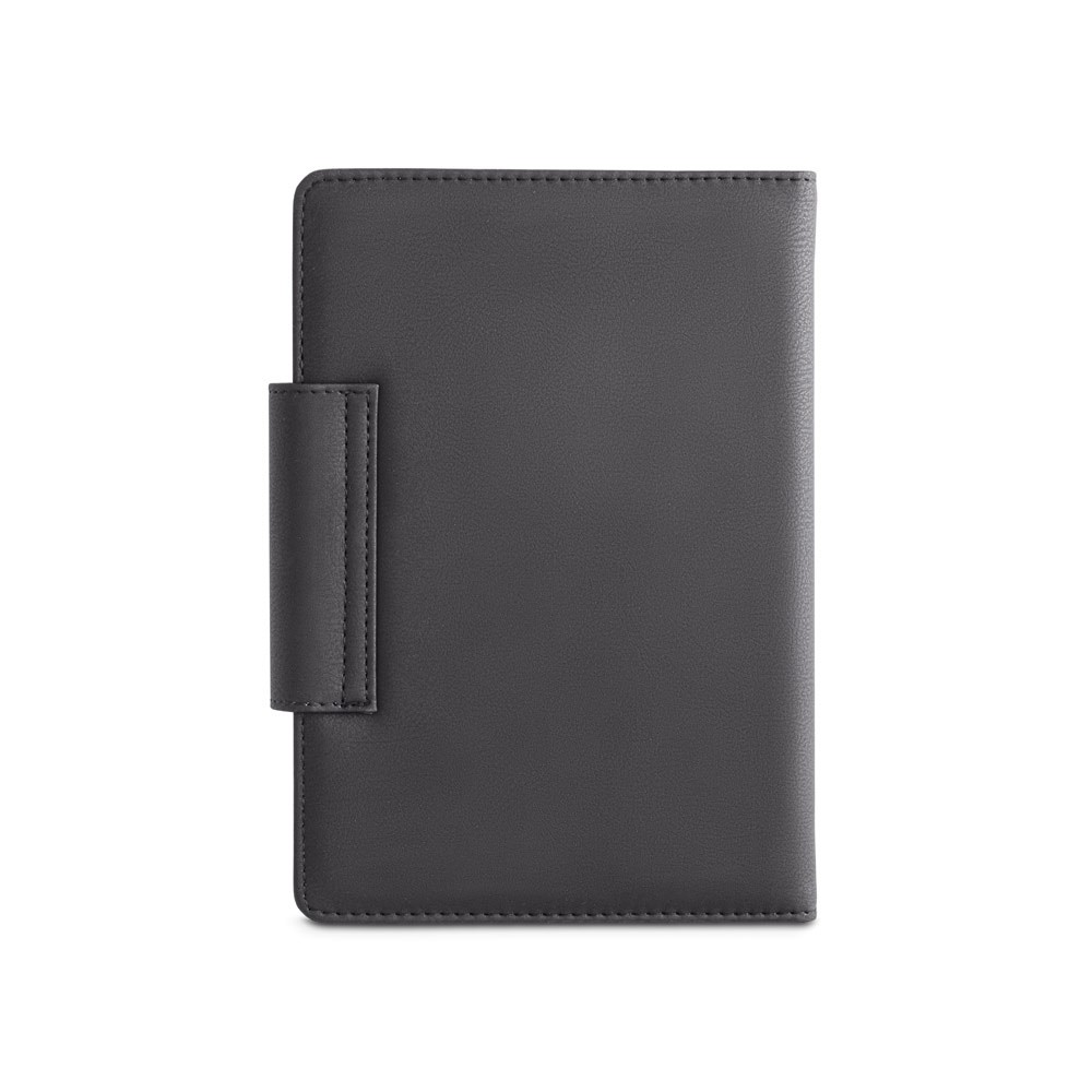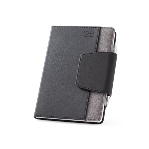 Diář A5 z imitace kůže a polyesterové tkaniny s magnetickým zapínáním, poutkem na pero a přední kapsou. Denní kalendárium. Dodáváno v obalu z netkané textilie. Pero je součástí balení. 148 x 210 mm | Obal: 205 x 250 mm