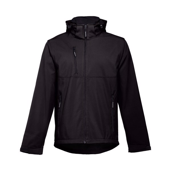 Softshellová pánská bunda z 96 % polyesteru a 4 % elastanu (280 g/m²), dvouvrstvá, s odnímatelnou kapucí a voděodolnou vrstvou. Bunda s fleecovou podšívkou, 2 předními kapsami a diagonální náprsní kapsou, vše na zip. Nastavitelné manžety se zapínáním na poutko. Odnímatelná kapuce se stahovací šňůrkou a smyčkou pro připevnění k límci. Zaoblený spodní lem na zadní straně. Velikosti: S, M, L, XL, XXL