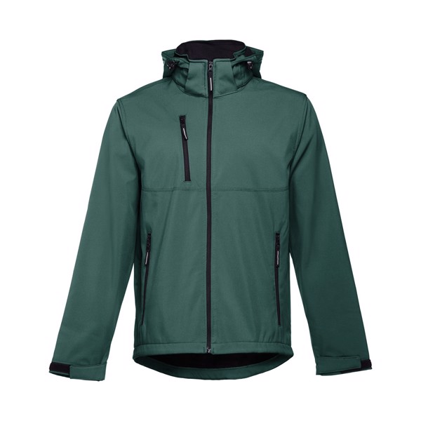 Softshellová pánská bunda z 96 % polyesteru a 4 % elastanu (280 g/m²), dvouvrstvá, s odnímatelnou kapucí a voděodolnou vrstvou. Bunda s fleecovou podšívkou, 2 předními kapsami a diagonální náprsní kapsou, vše na zip. Nastavitelné manžety se zapínáním na poutko. Odnímatelná kapuce se stahovací šňůrkou a smyčkou pro připevnění k límci. Zaoblený spodní lem na zadní straně. Velikosti: S, M, L, XL, XXL