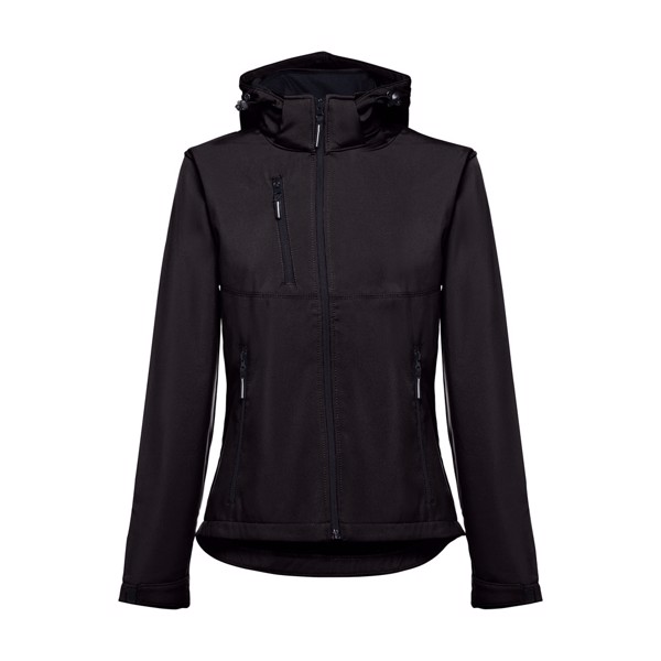 Dámská softshellová vesta z 96 % polyesteru a 4 % elastanu (280 g/m²), dvouvrstvá, s odnímatelnou kapucí a voděodolnou vrstvou. Bunda s podšívkou, 2 předními kapsami a diagonální náprsní kapsou, vše na zip. Nastavitelné manžety se zapínáním na poutko. Odnímatelná kapuce se stahovací šňůrkou a smyčkou pro připevnění k límci. Zaoblený spodní lem na zadní straně. Velikosti: S, M, L, XL, XXL