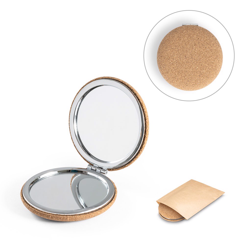Dvojité kulaté zrcátko v korkovém obalu se zapínáním na magnet. Dodáváno v sáčku z přírodního papíru. Protože je výrobek vyroben z přírodních materiálů, barva a velikost výrobku a výsledek tisku se mohou u jednotlivých výrobků lišit. ø73 x 20 mm