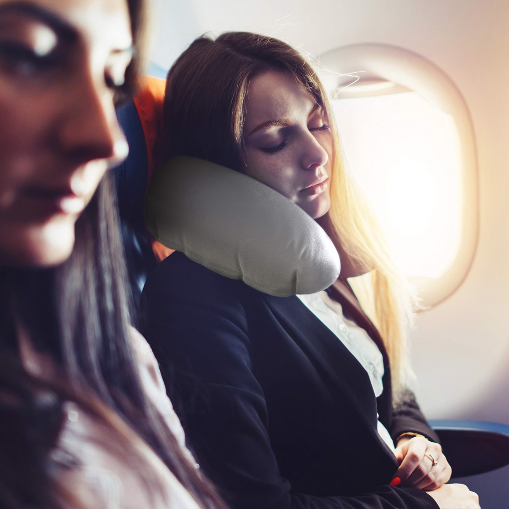 Cestovní sada s nafukovacím polštářem za krk, maskou na spaní, špunty do uší (nikoli jako osobní ochranné prostředky) a 1 párem ponožek. Dodáváno v pouzdře 190T. Obal: 150 x 200 mm