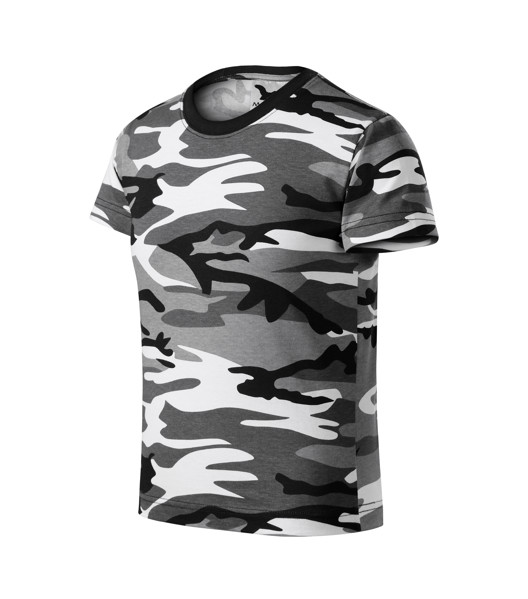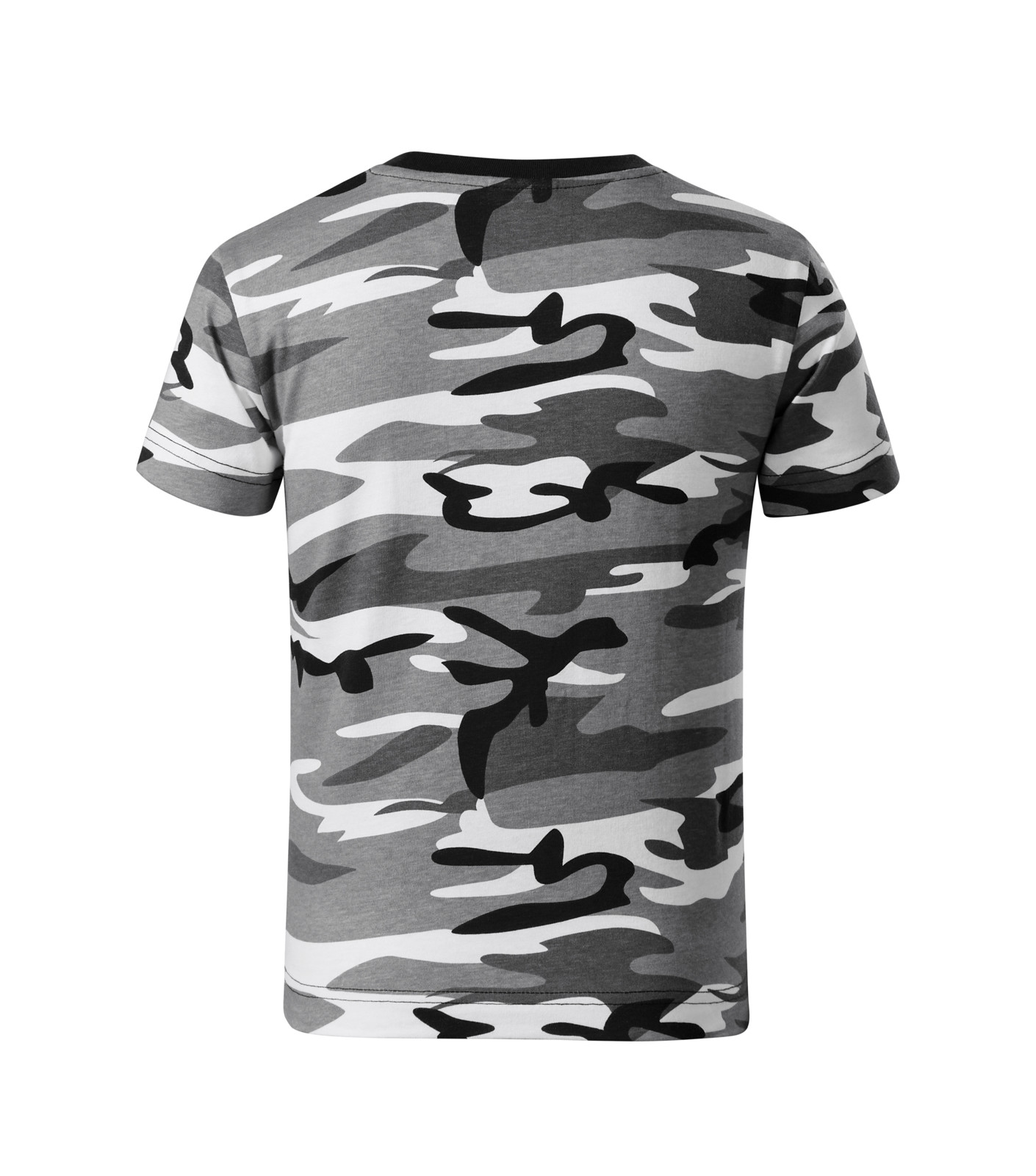 Střih s bočními švy, úzký lem průkrčníku z žebrového úpletu 1:1 s 5 % elastanu, vnitřní část průkrčníku začištěna páskou v barvě camouflage, zpevnění ramenních švů páskou