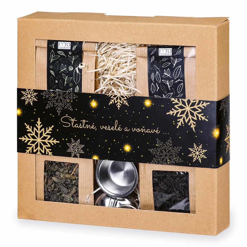 Dárková kazeta se sypanými ovocnými čaji a sítkem. Jahoda s echinaceou (100 g) a malina s rakytníkem (100 g).