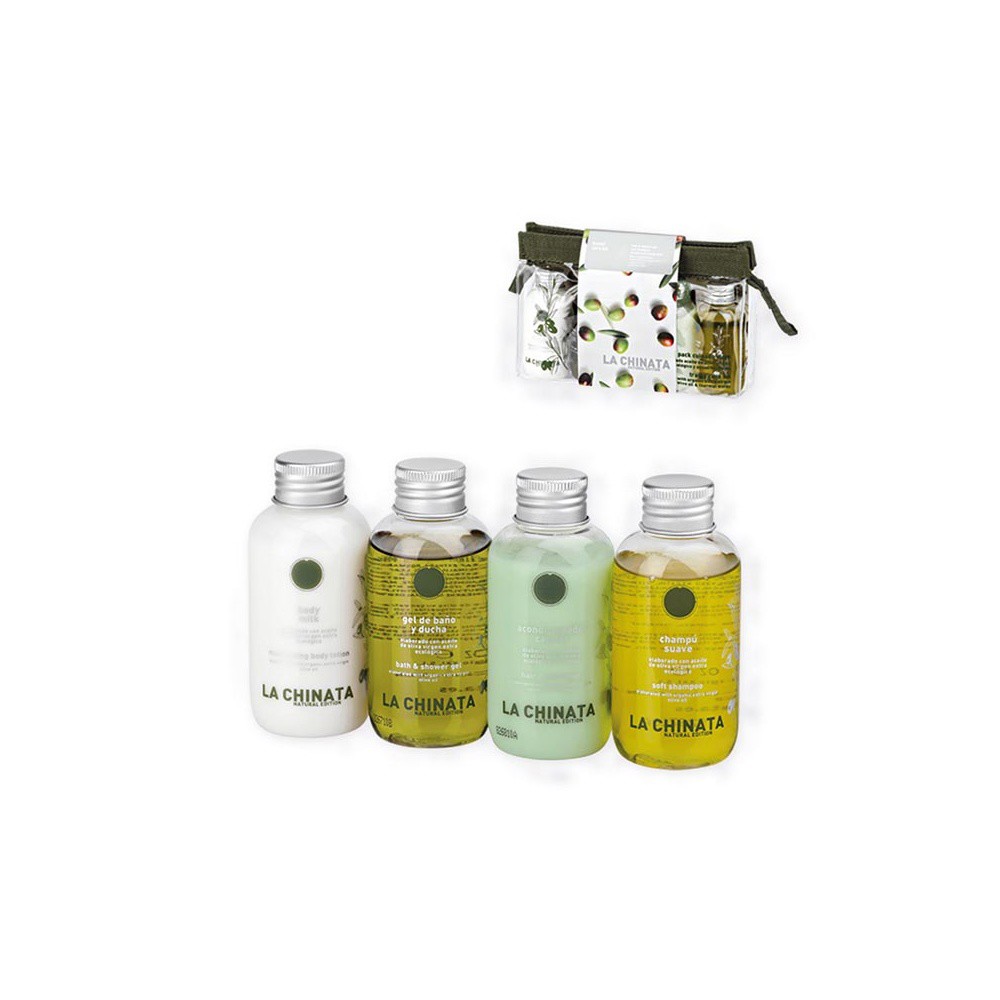 Cestovní balíček kosmetiky. Sprchový a koupelový gel 100 ml, jemný šampón 100 ml, kapilární kondicionér 100 ml, tělové mléko 100 ml.